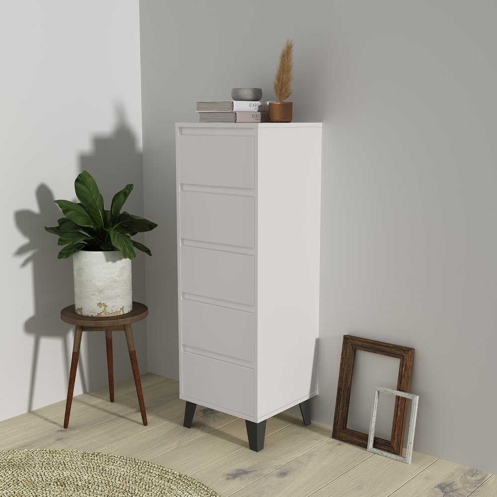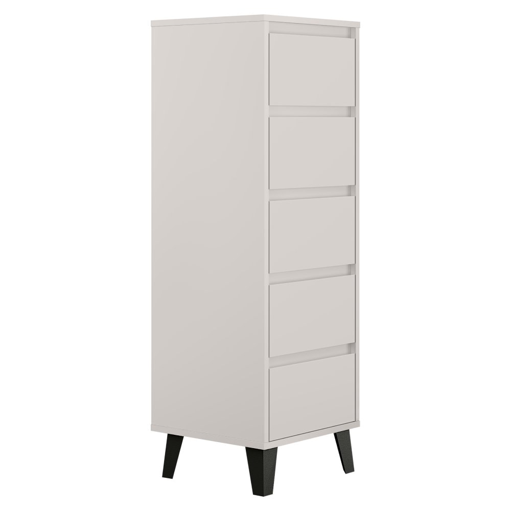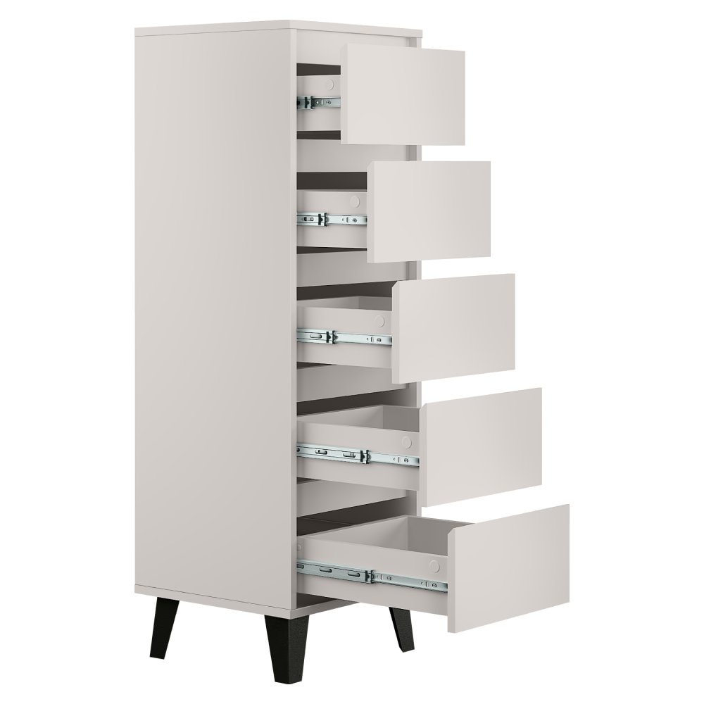 Materiál: laminovaná DTD Barva: kašmír Rozměry (ŠxHxV): 40x38,8x120,4 cm Výška spodního prostoru od podlahy: 12 cm Pět šuplíků Rozměr šuplíku (ŠxV): 36,2x18 cm Vnitřní rozměr šuplíku (ŠxHxV): 30,8x33,3x9 cm Na nožičkách Barva nožiček: černá Nosnost šuplíku: 5 kg Nosnost vrchní desky: 15 kg Moderní…