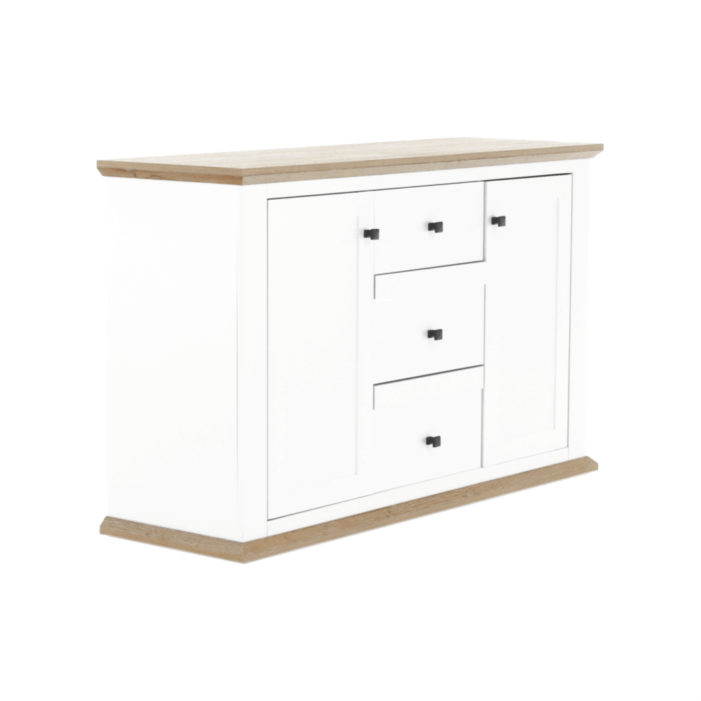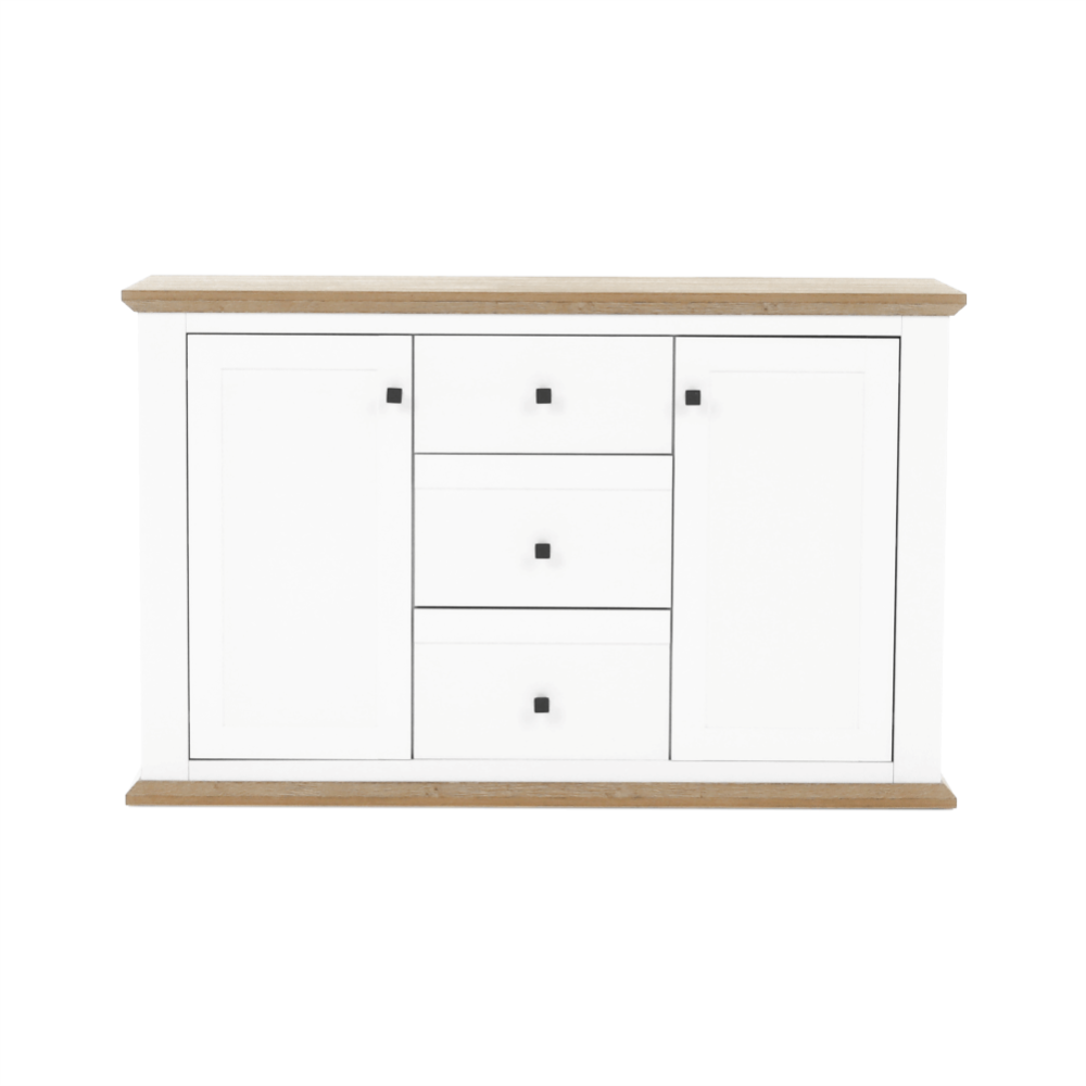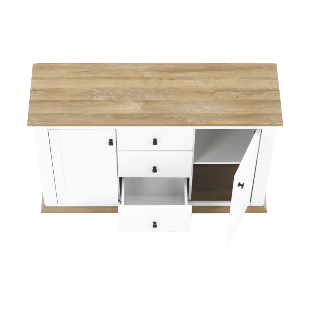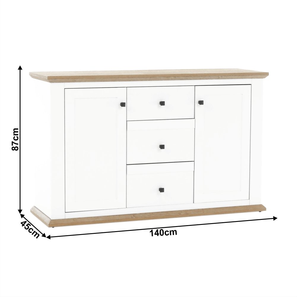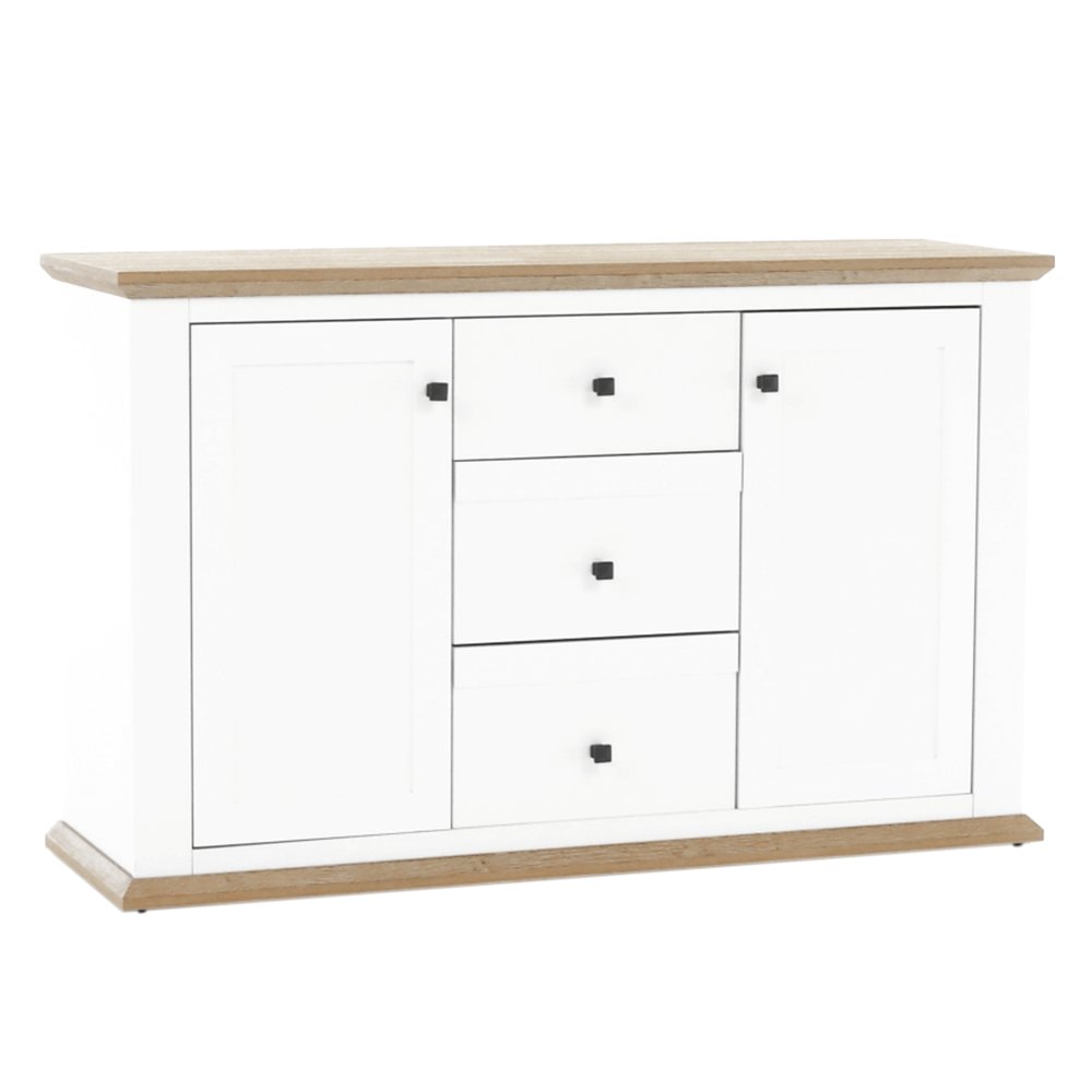 Materiál: DTD laminovaná / ABS hrany Barva: bílá / dub grand Rozměry (ŠxHxV): 140x45x87 cm Tloušťka materiálu: 40 mm dvoudveřová dvě skříňky tři šuplíky S úchytkami S 3D efektem elegantní V provensálském stylu kovové úchytky Dodávané v demontu