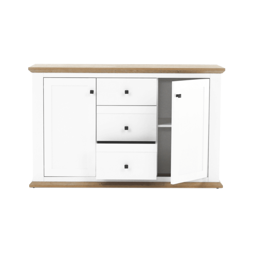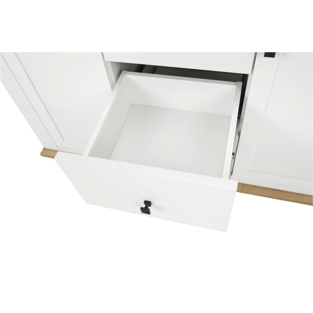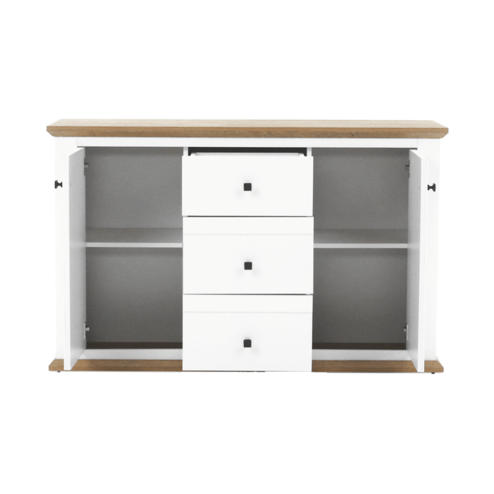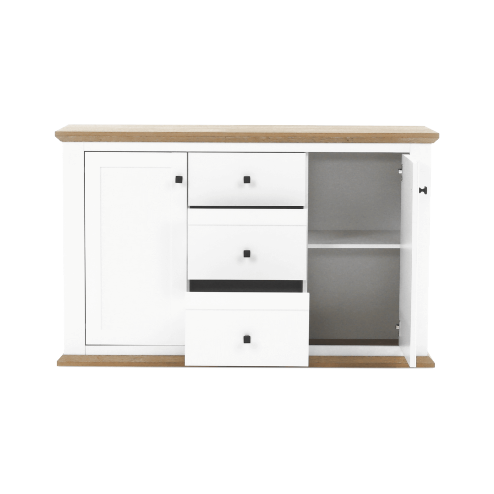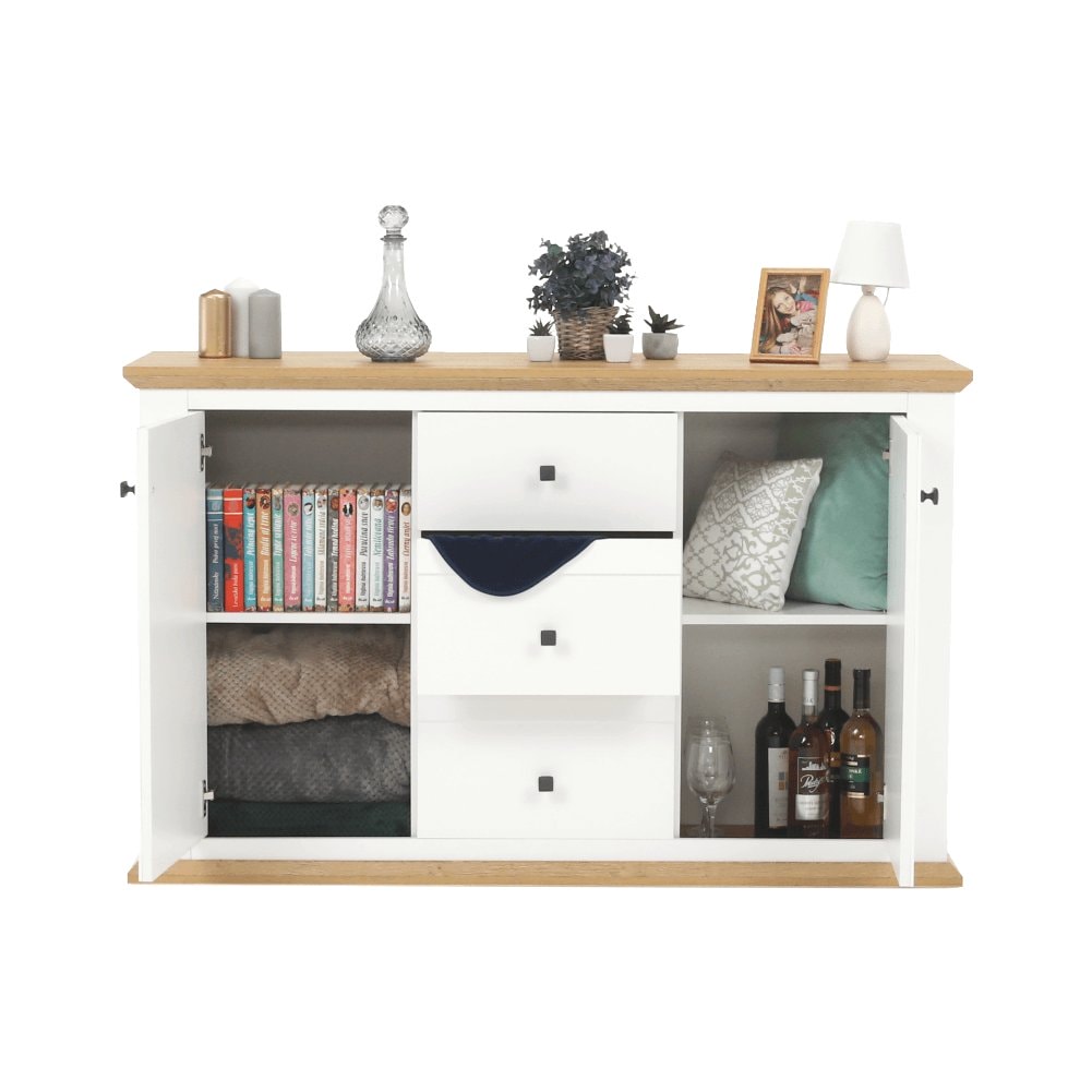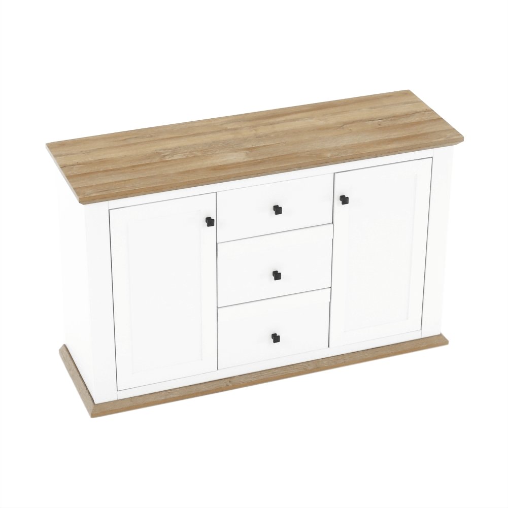 Materiál: DTD laminovaná / ABS hrany Barva: bílá / dub grand Rozměry (ŠxHxV): 140x45x87 cm Tloušťka materiálu: 40 mm dvoudveřová dvě skříňky tři šuplíky S úchytkami S 3D efektem elegantní V provensálském stylu kovové úchytky Dodávané v demontu