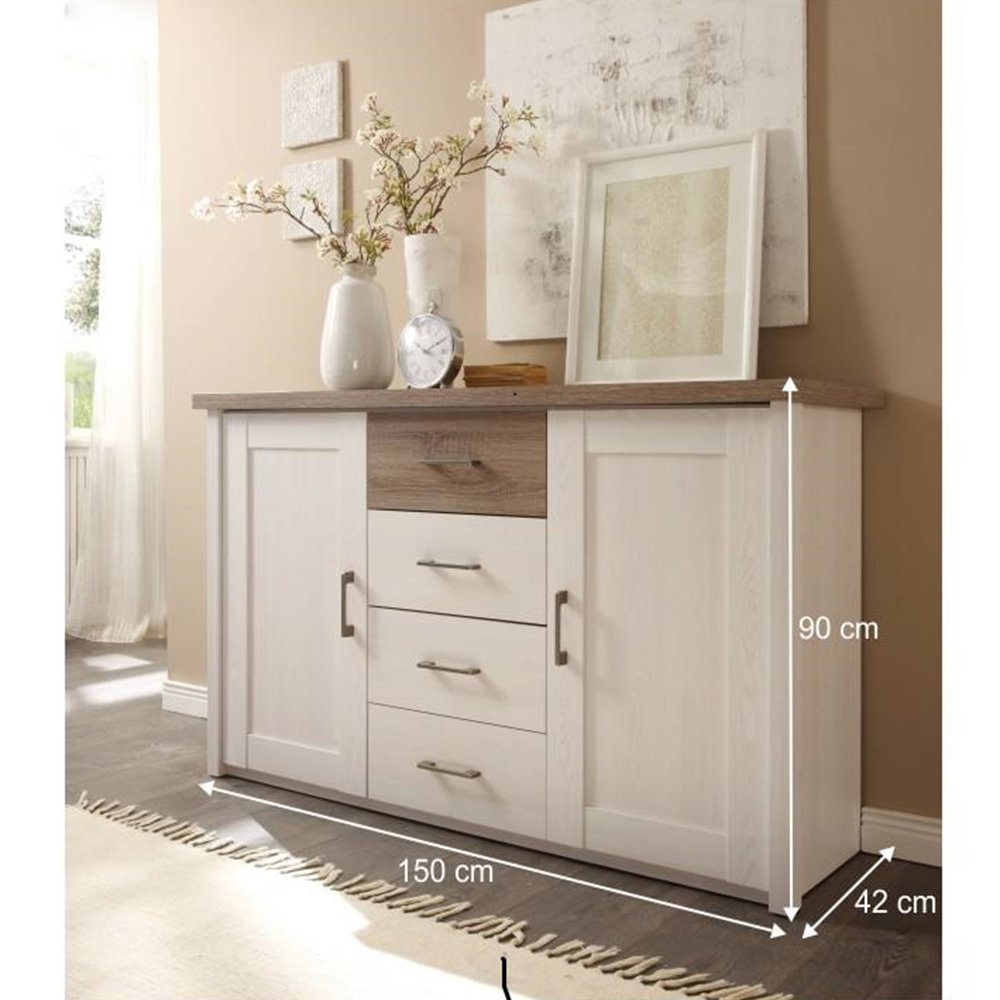 komoda LUMERA Materiál: DTD fóliovaná Barva: Dub sonoma truflový / pinie bílá Rozměry (ŠxHxV): 150x42x90 cm Tloušťka materiálu korpus: 18/36 mm Dodávané v demontu.