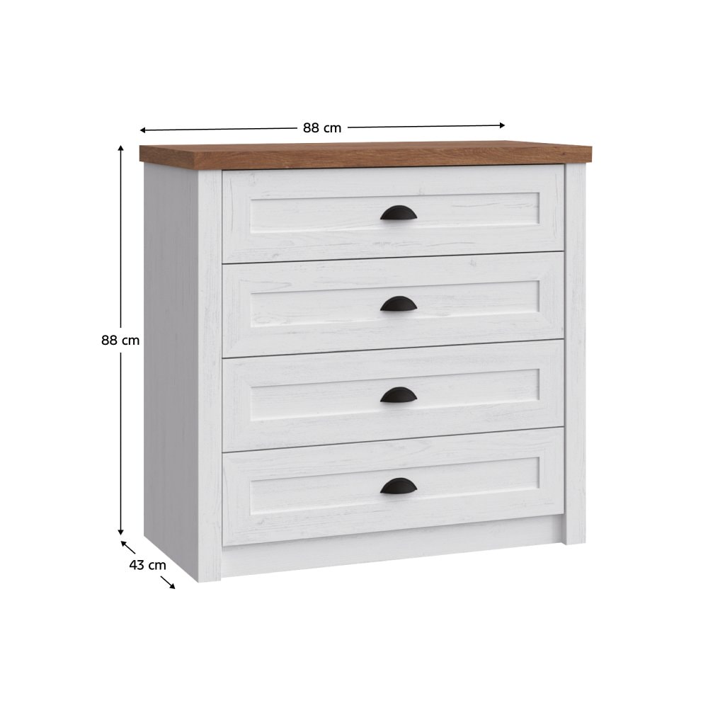Materiál: DTD laminovaná Barva: sosna andersen/dub lefkas Rozměry (ŠxHxV): 88x43x88 cm Tloušťka materiálu korpus: 15 mm Tloušťka materiálu horní desky: 36 mm Čtyři šuplíky S úchytkami Dodáváno v demontu