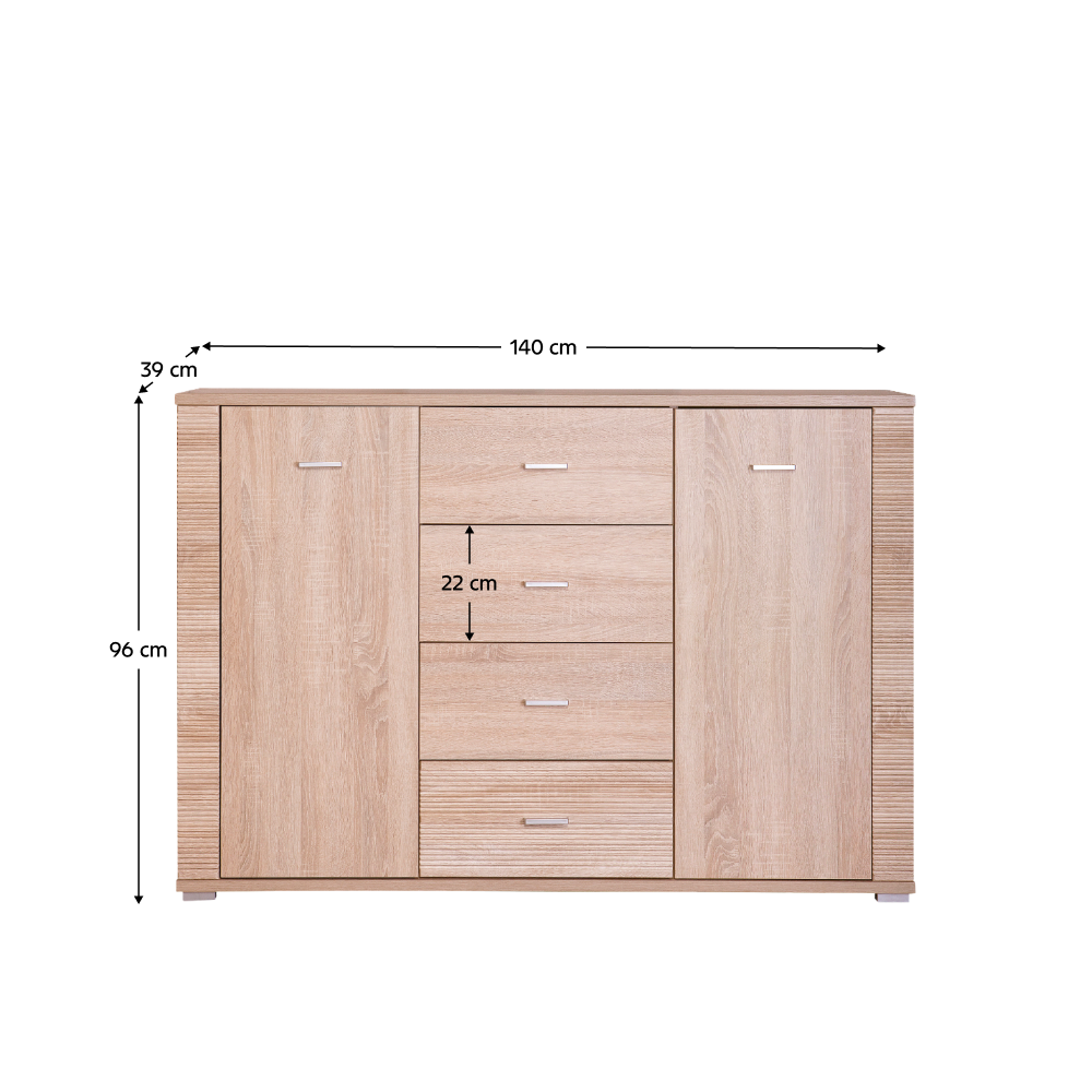 Komoda dvoudveřová typ 09, se 4 zásuvkami, vhodný na zařízení obývacích pokojů, ložnic i pracoven, materiál: DTD laminovaná. Hrany jednotlivých komponentů jsou ukončeny vroubkovanou lištou. Barevné provedení: dub sonoma. Rozměry (ŠxVxH): 140x96x39 cm. Tloušťka materiálu korpus: 16 mm Tloušťka…