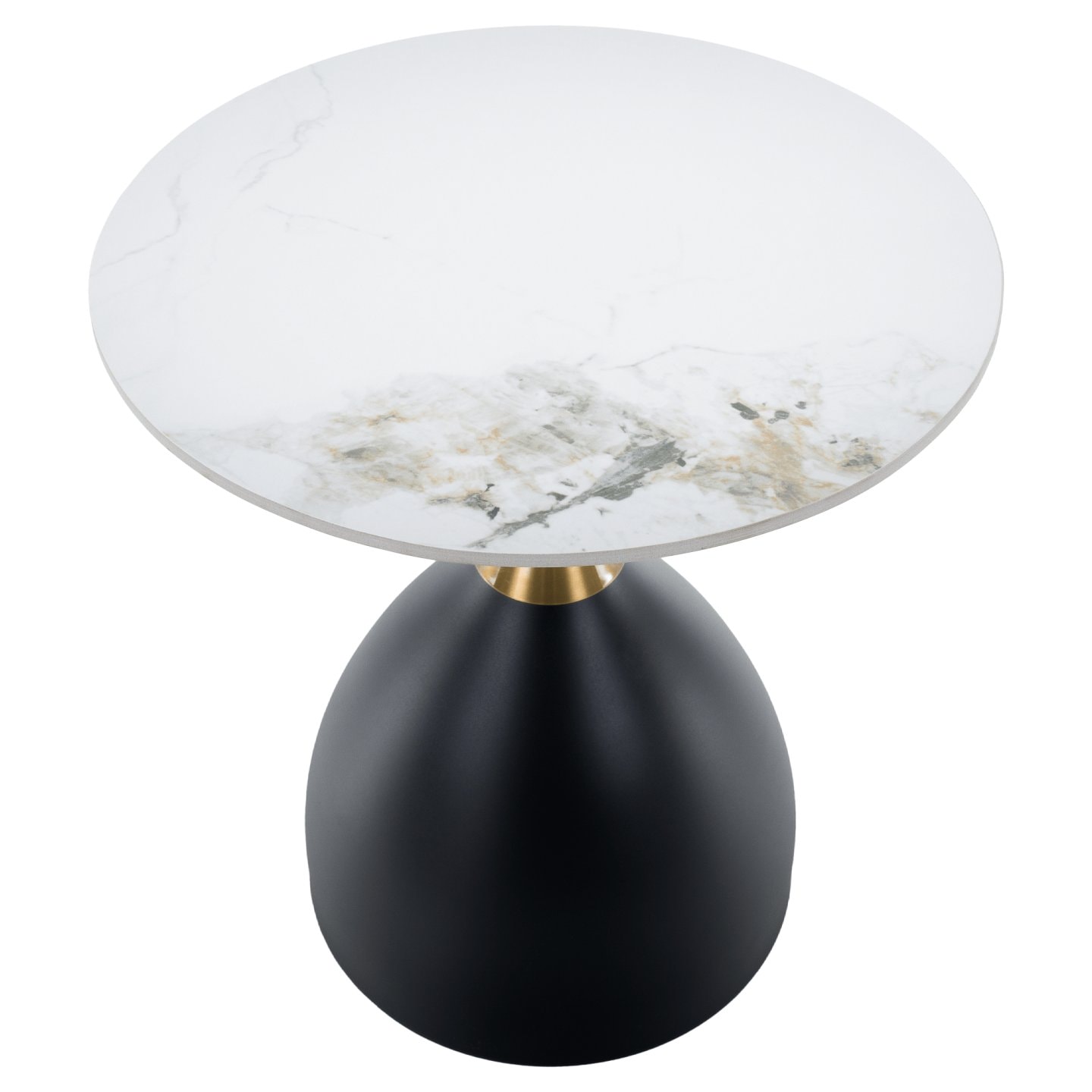 Materiál deska stolu: broušený kámen Barevné provedení: bílý mramor Konstrukce nohy: ocel Barevné provedení: černá Rozměry (PxV): 50x54 cm Tloušťka platu stolu: 1,1 cm Zlatý dekorativní proužek Originální kousek Kulatý Moderní a stylový Nosnost: 15 kg Dodáváno v demontu