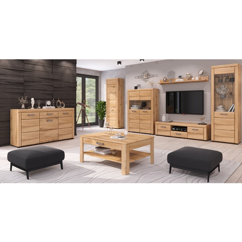 Vyroben je z laminované DTD v barevném provedení apalačský dub o tl. 19mm. Dvířka jsou vyrobeny z MDF. Pro lepší manipulaci je systém vybaven šedými kovovými úchyty. Celkový vzhled obývacího systému dotvářejí dřevěné nožičky. Je vhodný na zařízení obývacích pokojů, jídelen a předsíní. Komponenty ze sektorového systému se objednávají jednotlivě, díky čemuž si můžete vytvořit sestavu podle vašich představ. Pořiďte si obývací systém Pusan, který zpříjemní vaše domácí prostředí a pohladí vás na duši.