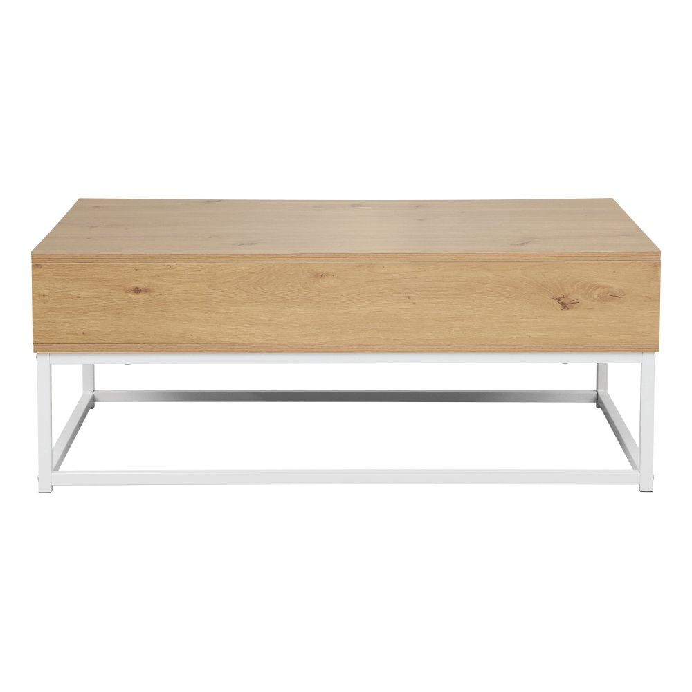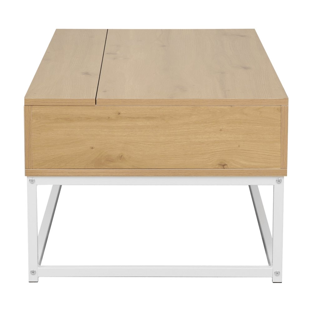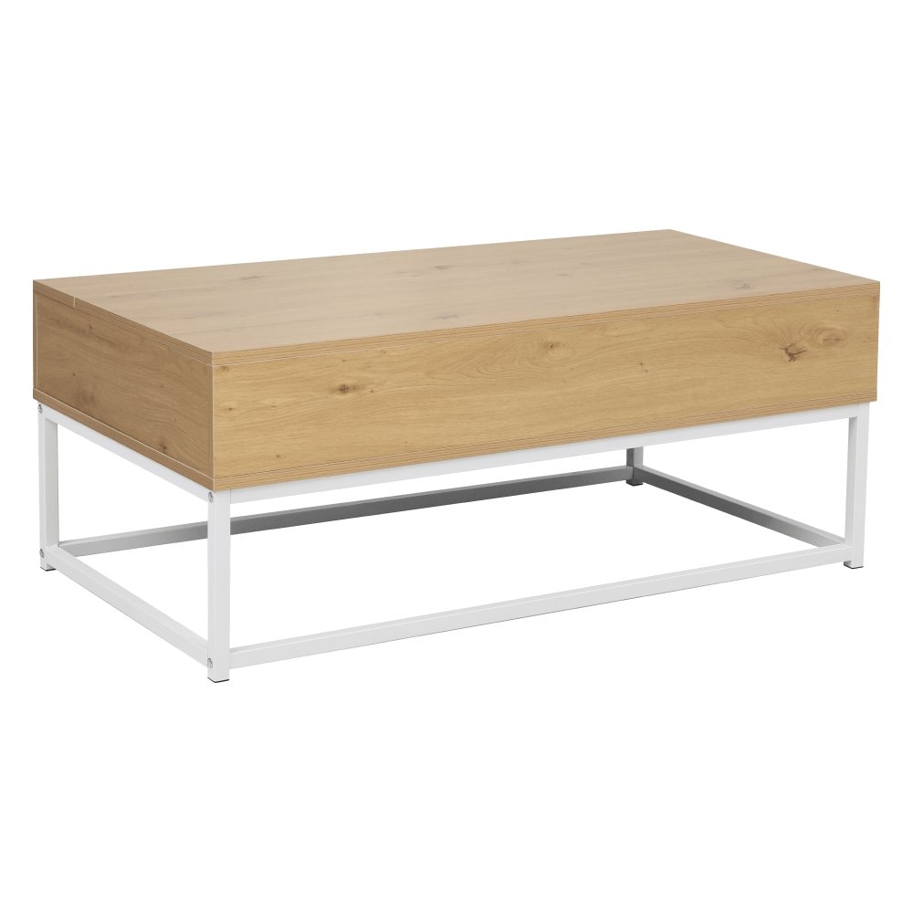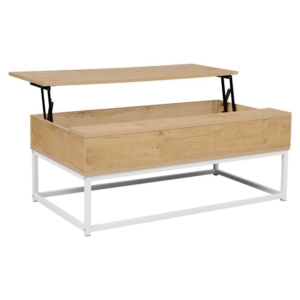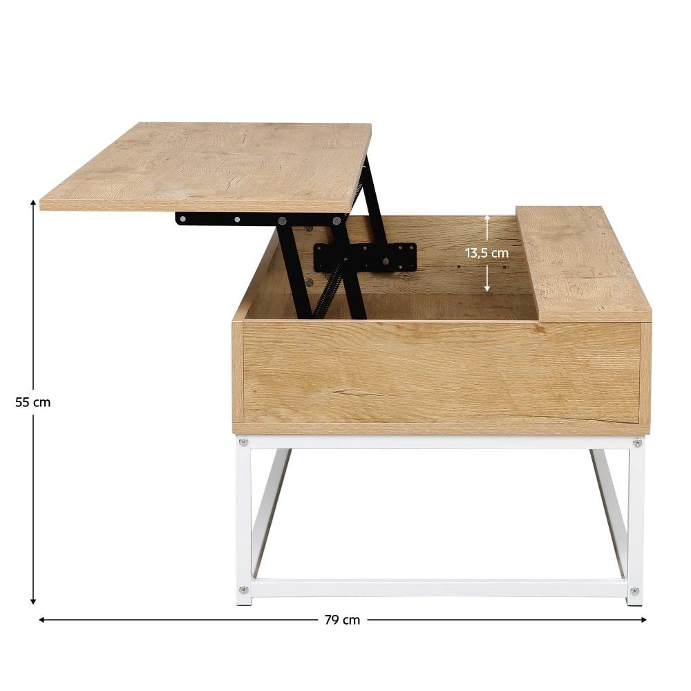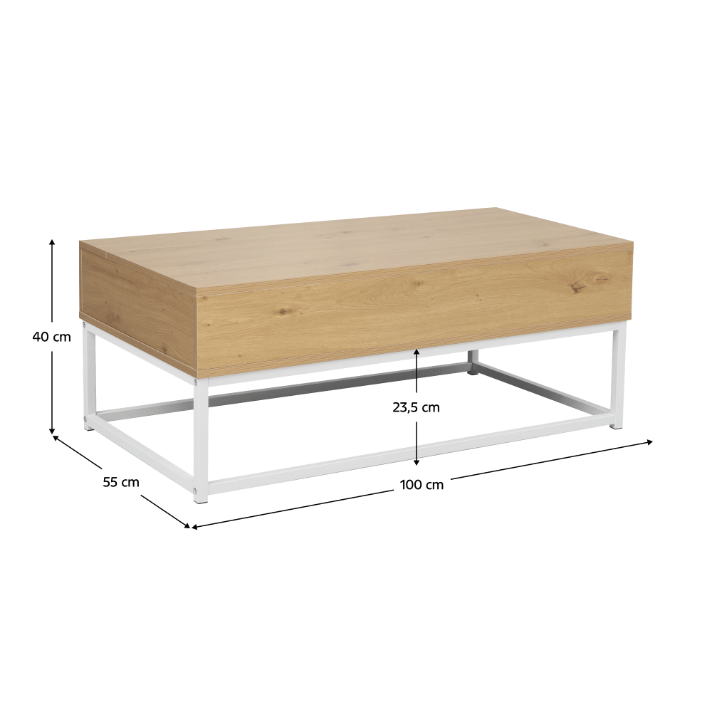 Disponuje výklopnou horní plochou, pod kterou naleznete vnitřní úložný prostor, kam snadno uschováte věci každodenní potřeby, případně knížky nebo časopisy. Výsuvná horní plocha se otevírá pomocí ručního mechanismu, díky čemuž si můžete z konferenčního stolku vytvořit místo ideální například pro práci s počítačem. Vyroben je z laminované DTD v barevném provedení dub, rám je z kovu v bílé barvě. Svým moderním designem přinese do interiéru šmrnc a eleganci.