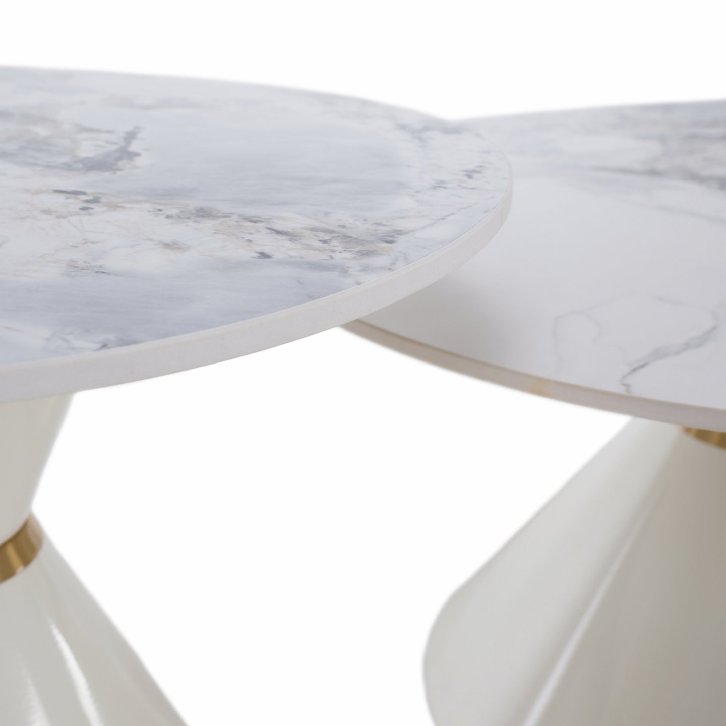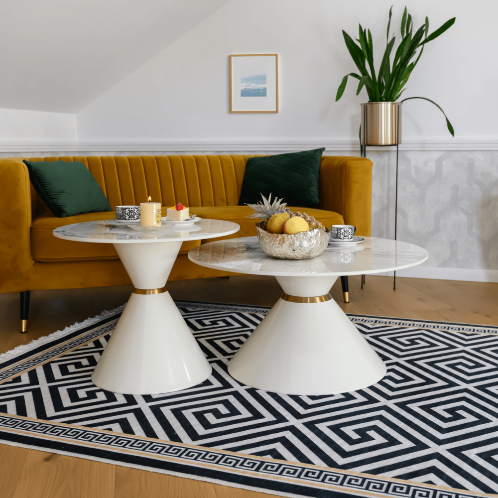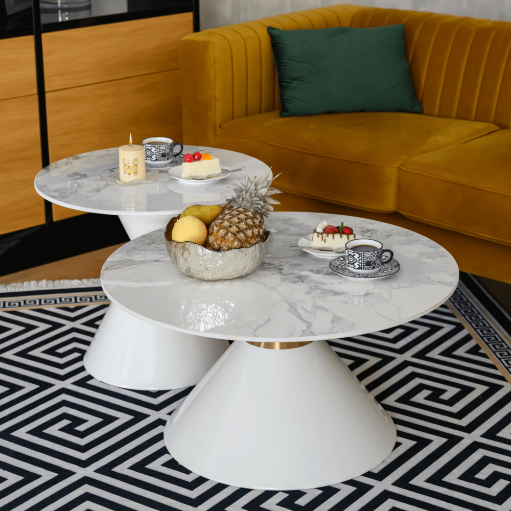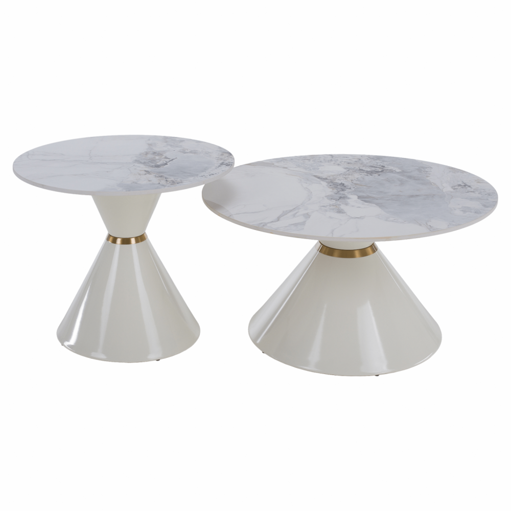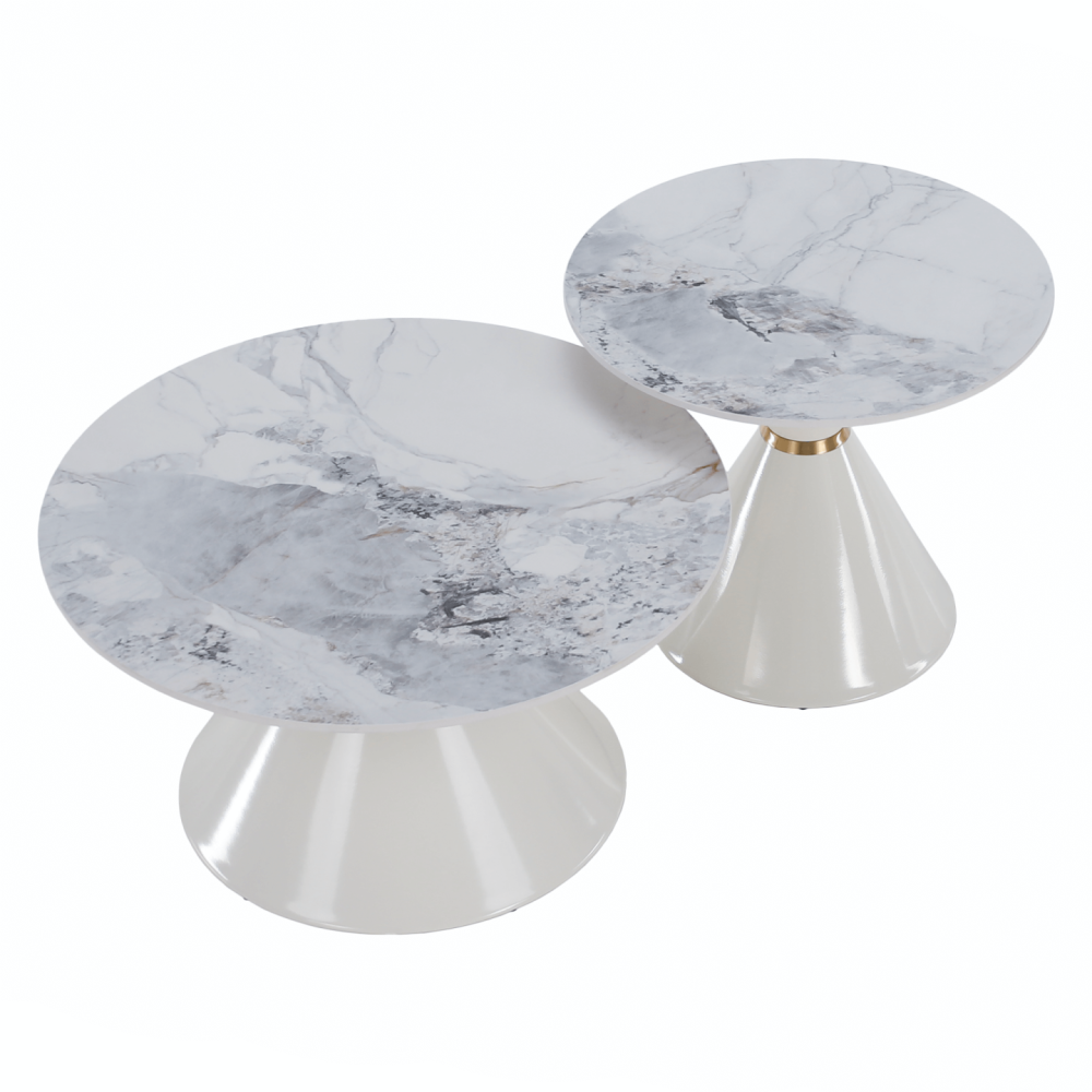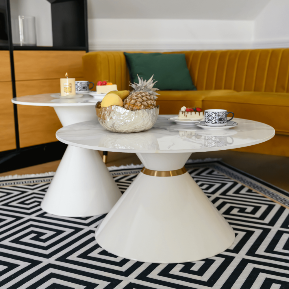 Kolekce MABUZ nabízí set 2 konferenčních stolků, které svým designem obohatí každý interiér. MABUZ set představuje kulaté stolky, které jsou vyrobeny z broušeného kamene v barevném provedení bílý mramor. Ocelová noha ve tvaru zvonu je pevná a poskytuje stolkům stabilitu. Je v bílé barvě a doplněna páskem ve zlaté barvě. Doplněk, který zvedne úroveň jakékoli místnosti.