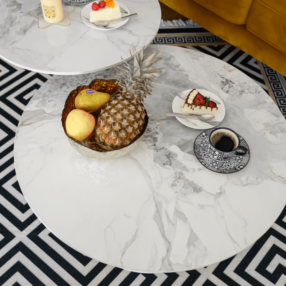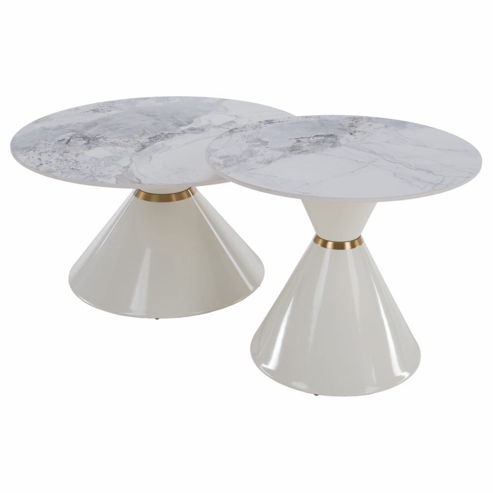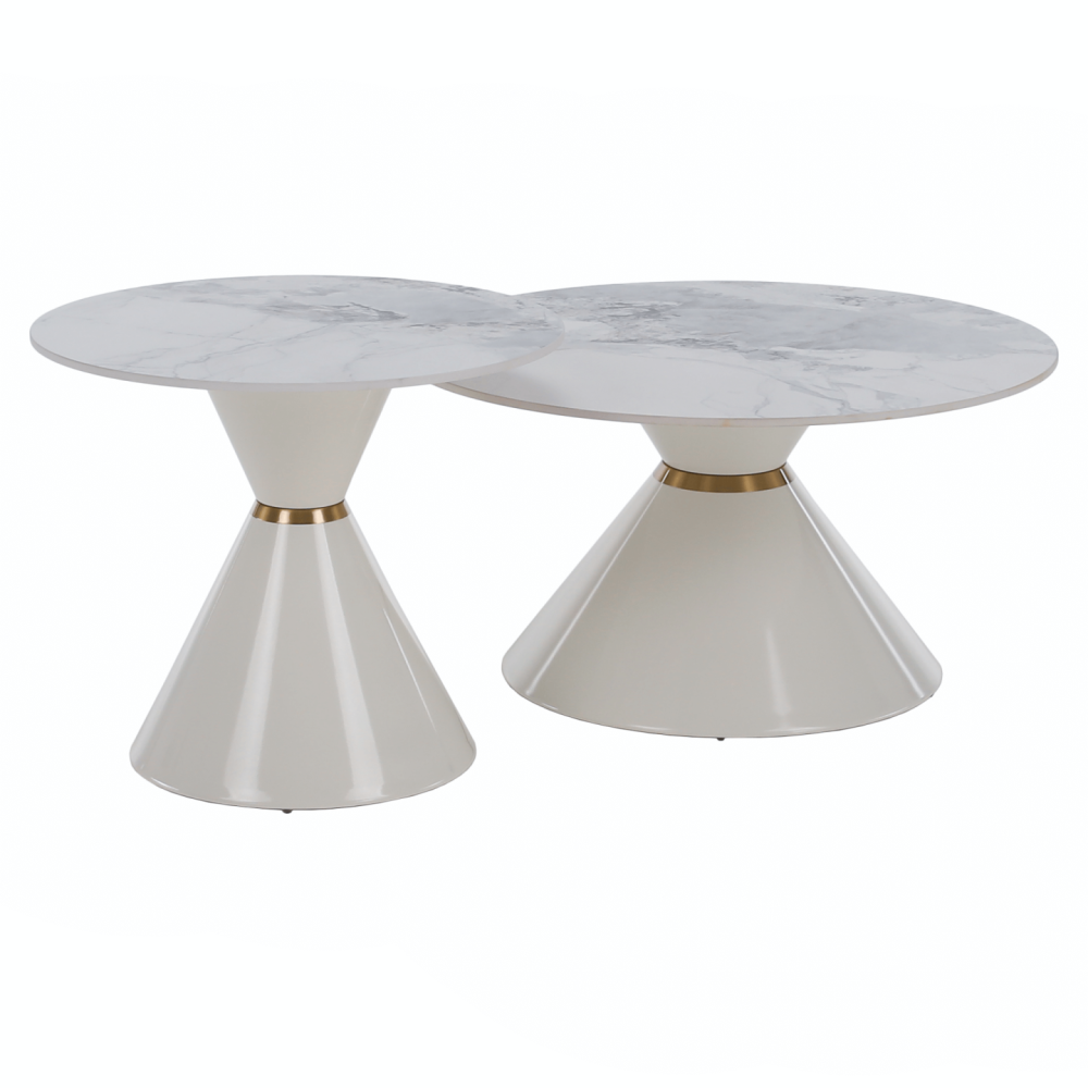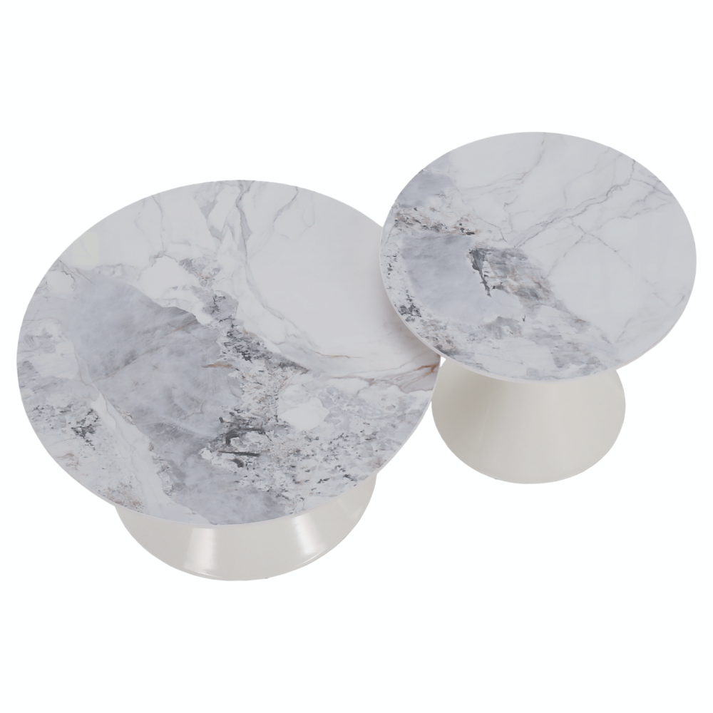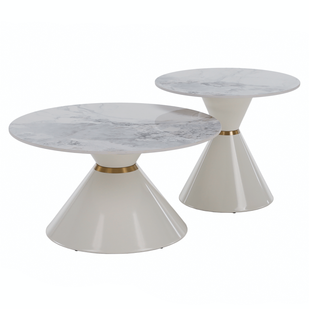 Kolekce MABUZ nabízí set 2 konferenčních stolků, které svým designem obohatí každý interiér. MABUZ set představuje kulaté stolky, které jsou vyrobeny z broušeného kamene v barevném provedení bílý mramor. Ocelová noha ve tvaru zvonu je pevná a poskytuje stolkům stabilitu. Je v bílé barvě a doplněna páskem ve zlaté barvě. Doplněk, který zvedne úroveň jakékoli místnosti.