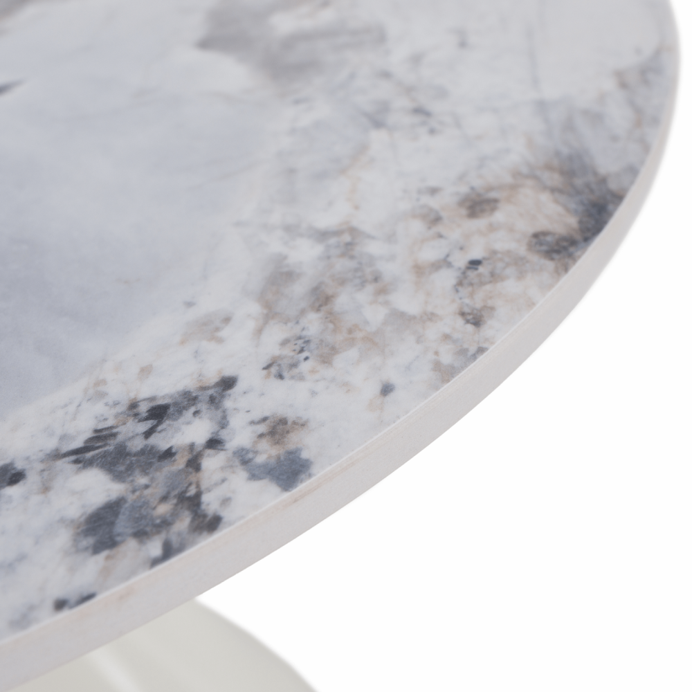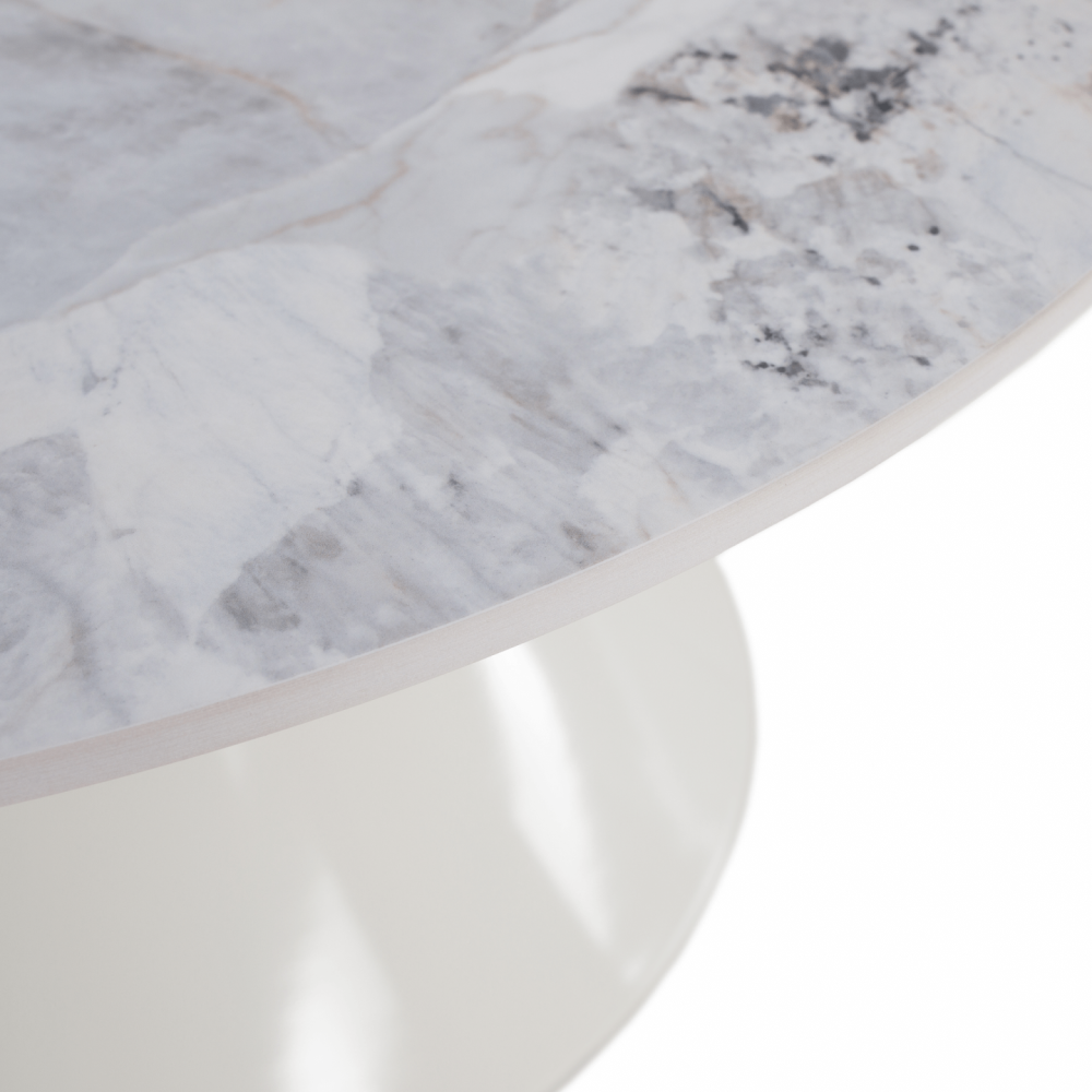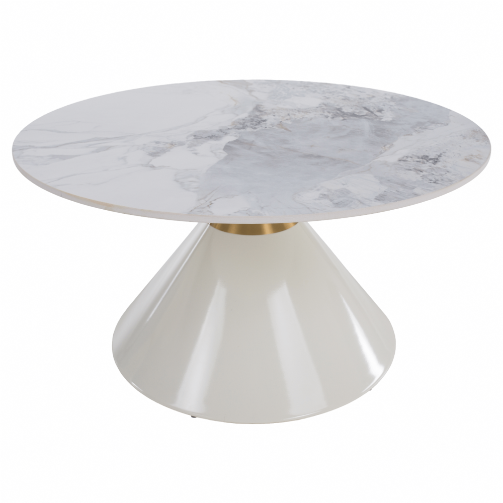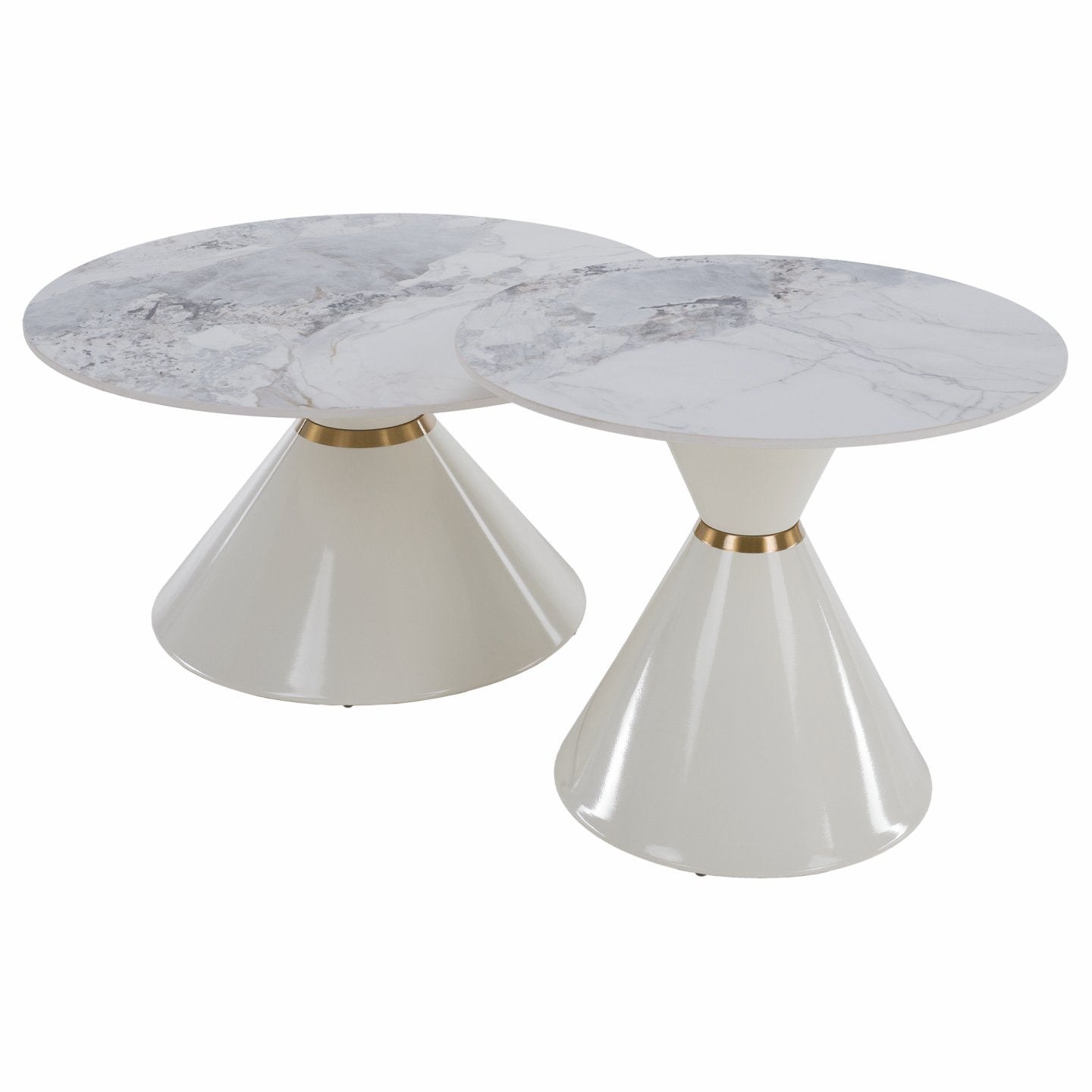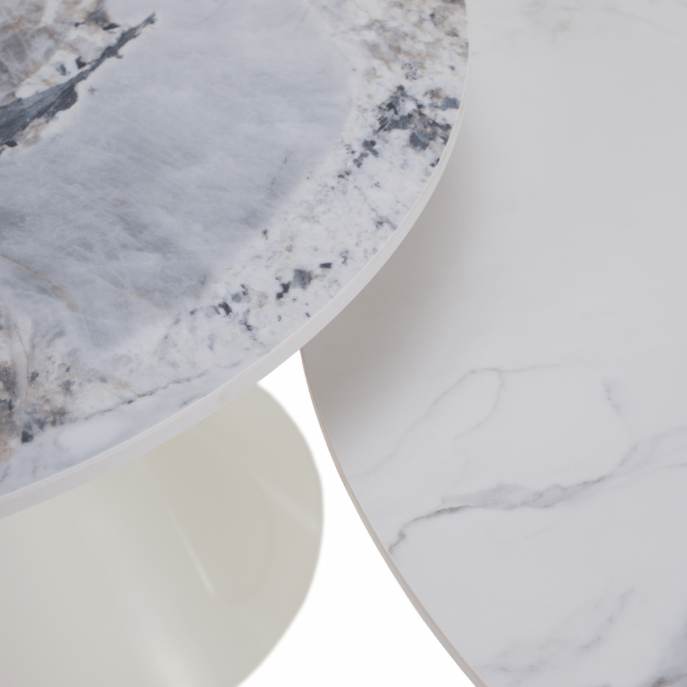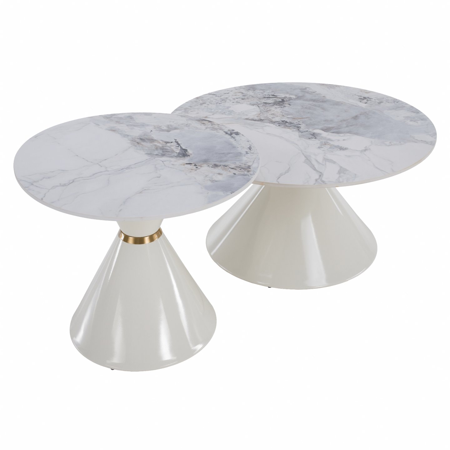 Kolekce MABUZ nabízí set 2 konferenčních stolků, které svým designem obohatí každý interiér. MABUZ set představuje kulaté stolky, které jsou vyrobeny z broušeného kamene v barevném provedení bílý mramor. Ocelová noha ve tvaru zvonu je pevná a poskytuje stolkům stabilitu. Je v bílé barvě a doplněna páskem ve zlaté barvě. Doplněk, který zvedne úroveň jakékoli místnosti.