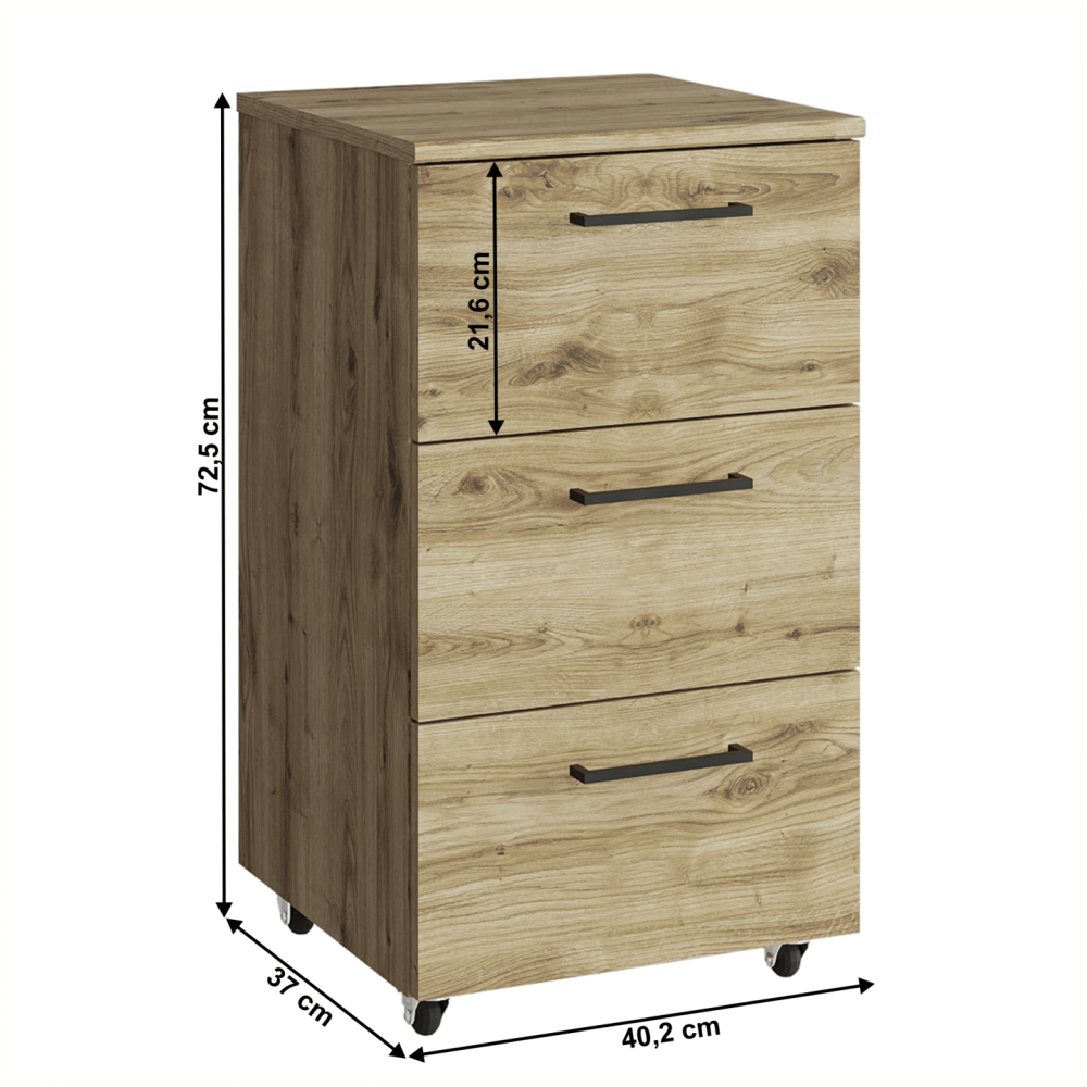 Kontejner DORSI 3S Materiál: DTD laminovaná/MDF Barva: dub navarra Rozměry (ŠxHxV): 40,2x37x72,5 cm Tloušťka materiálu: 1,6 cm Tři šuplíky Na kolečkách Nosnost: 5 kg Plastové úchytky Barva úchytek: černá Moderní design Dodáváno v demontu