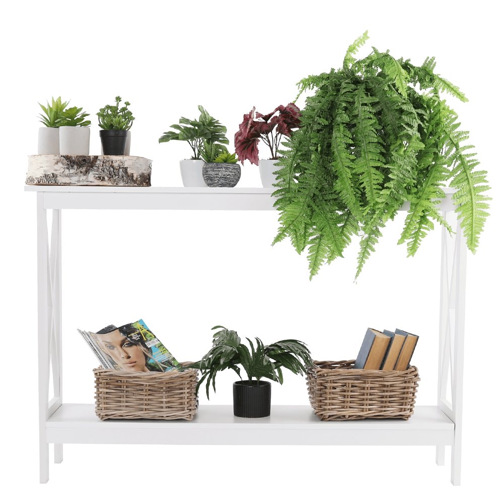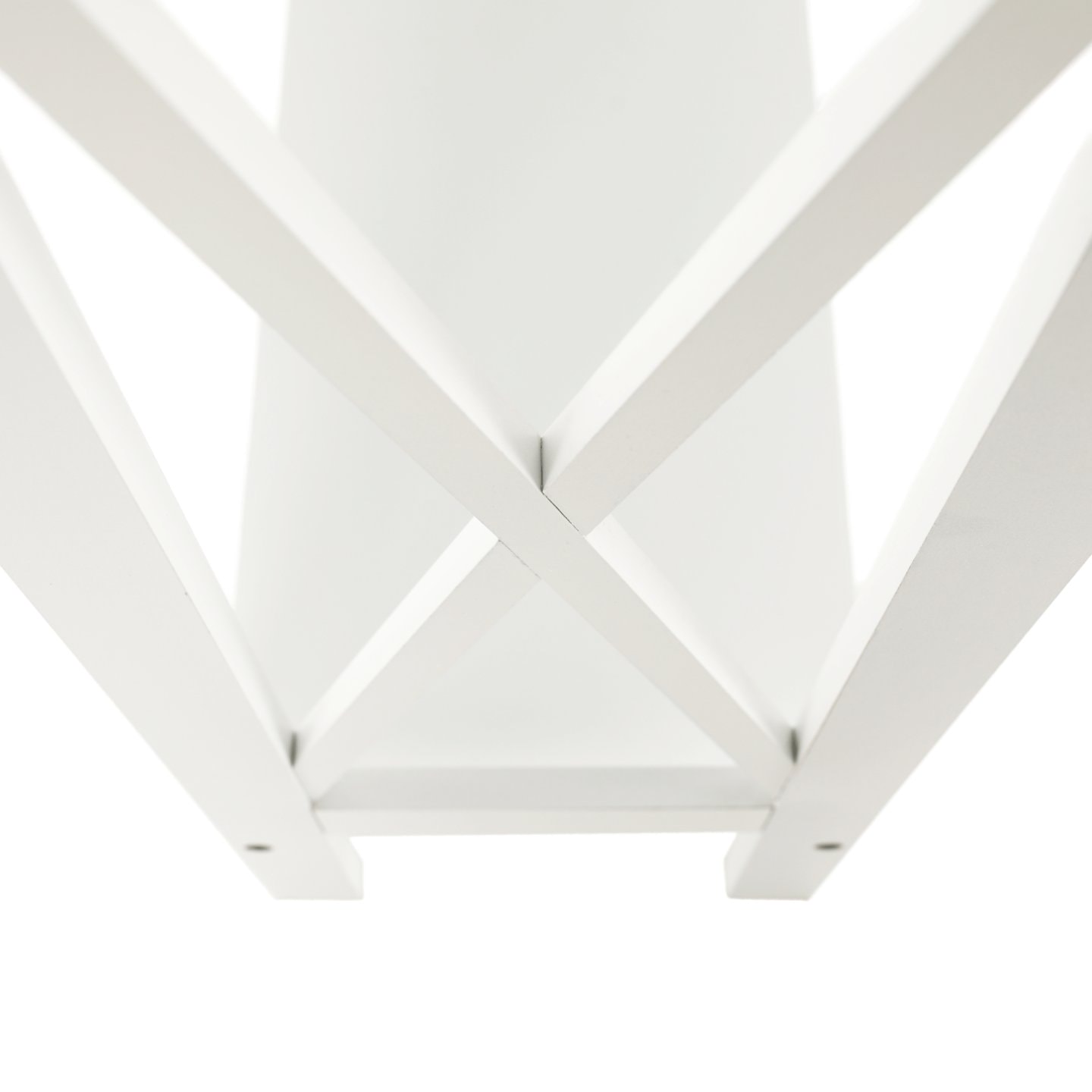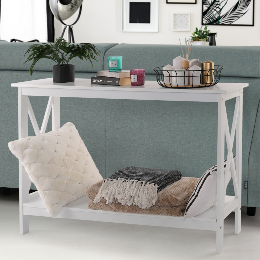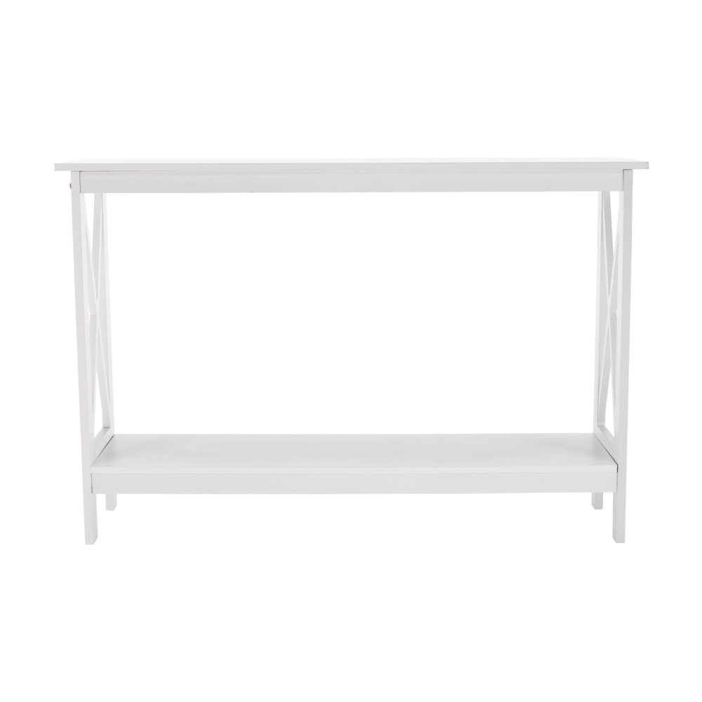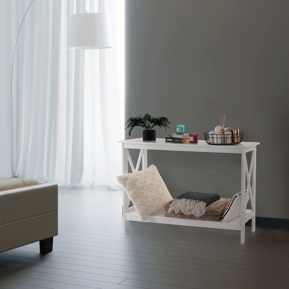 Na jeho výrobu byla použita MDF v bílém barevném provedení. Stolek v spodní části disponuje policí. Na vrchní desku si můžete vystavit dekorativní předměty, suvenýry, fotografie, vázu s květinami nebo hrnkové květiny i svíčky. V předsíni ho využijete na odložení klíčů, kabelky a tašky, různých doplňků a všeho, co při odchodu z domu potřebujete mít na očích a ihned po ruce.