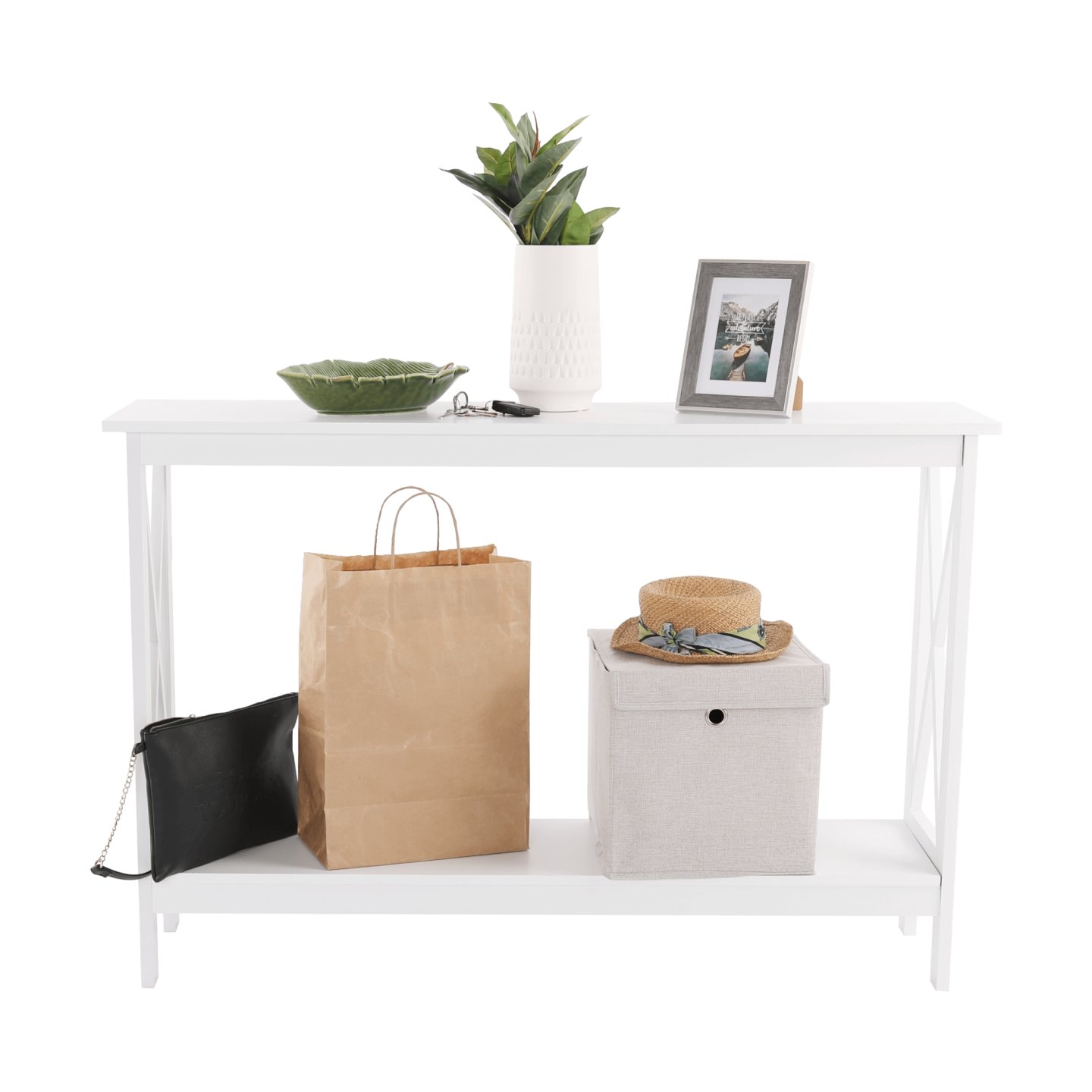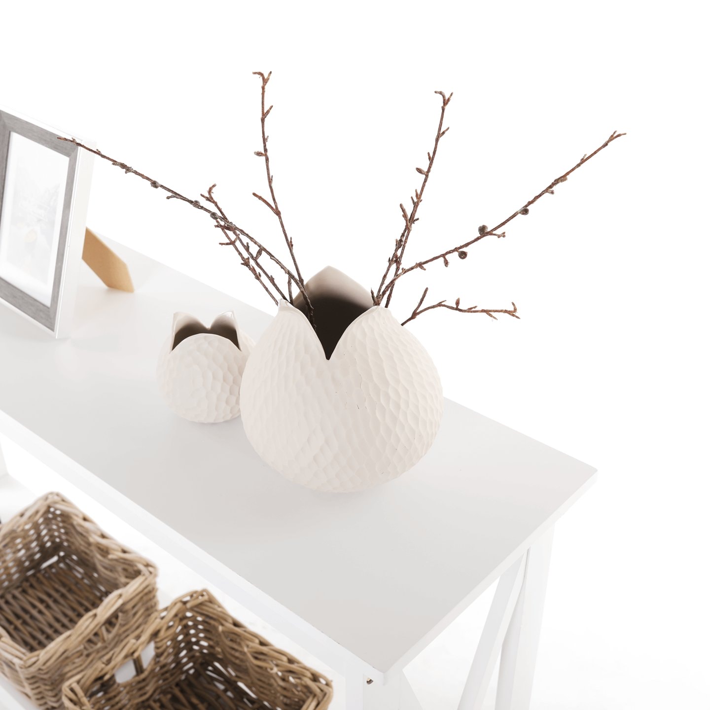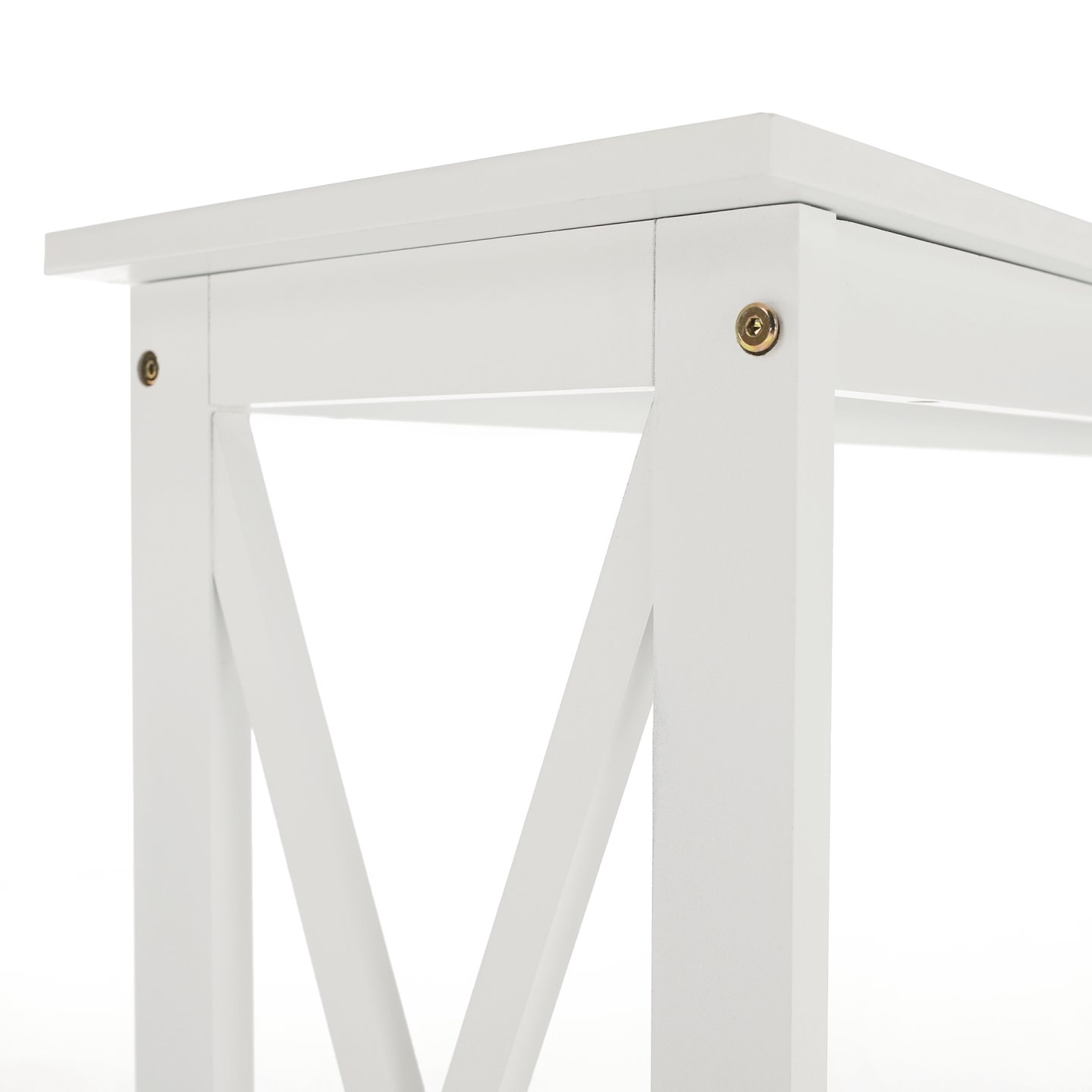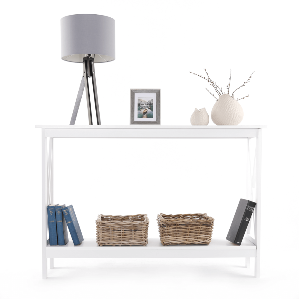 Na jeho výrobu byla použita MDF v bílém barevném provedení. Stolek v spodní části disponuje policí. Na vrchní desku si můžete vystavit dekorativní předměty, suvenýry, fotografie, vázu s květinami nebo hrnkové květiny i svíčky. V předsíni ho využijete na odložení klíčů, kabelky a tašky, různých doplňků a všeho, co při odchodu z domu potřebujete mít na očích a ihned po ruce.