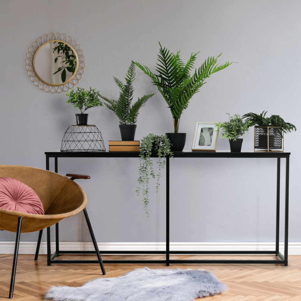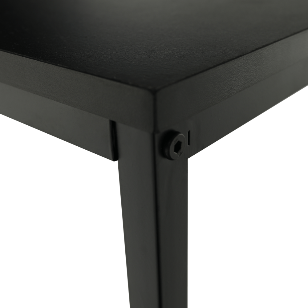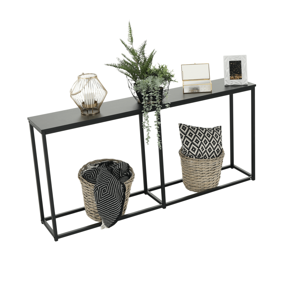 Zaujme vás jednoduchým, ale univerzálním provedením. Můžete si na něj položit rodinné fotografie, vázu s květinami, dekoraci, knihy, toaletní potřeby, šperkovnici nebo jen misku s klíči. Velmi výraznou rysem našeho stolku je ocelová konstrukce v černém provedení, doplněná deskami z fóliované DTD v provedení šedý grafit.