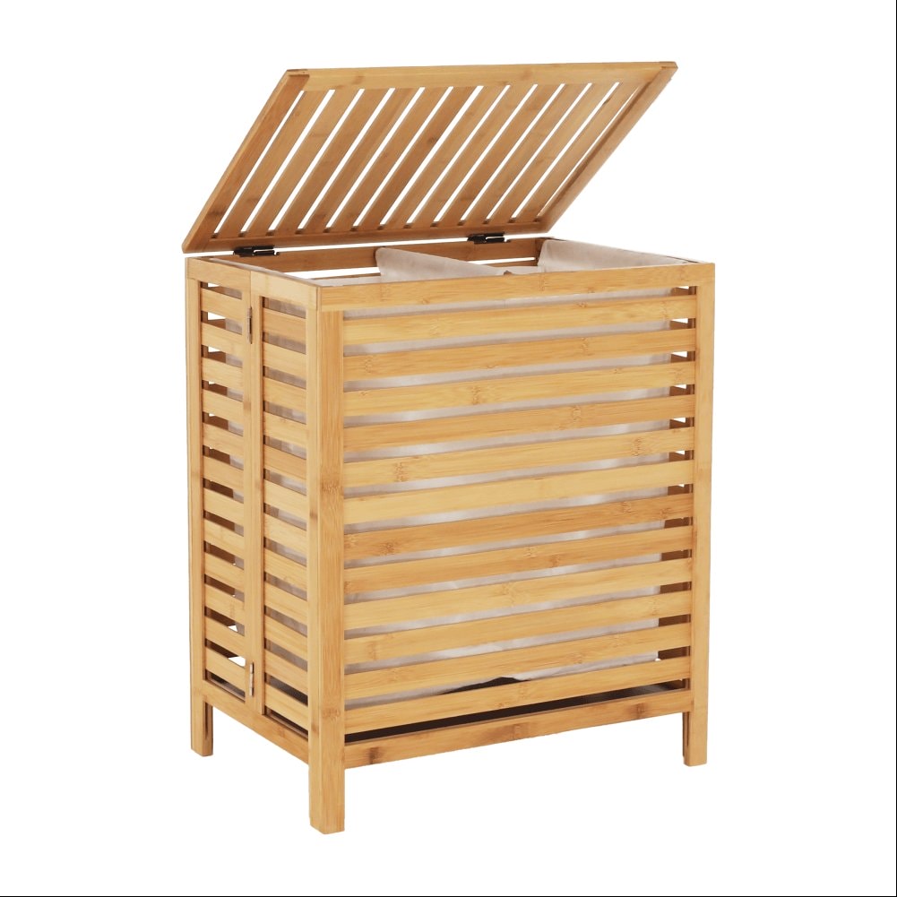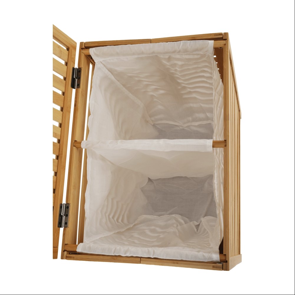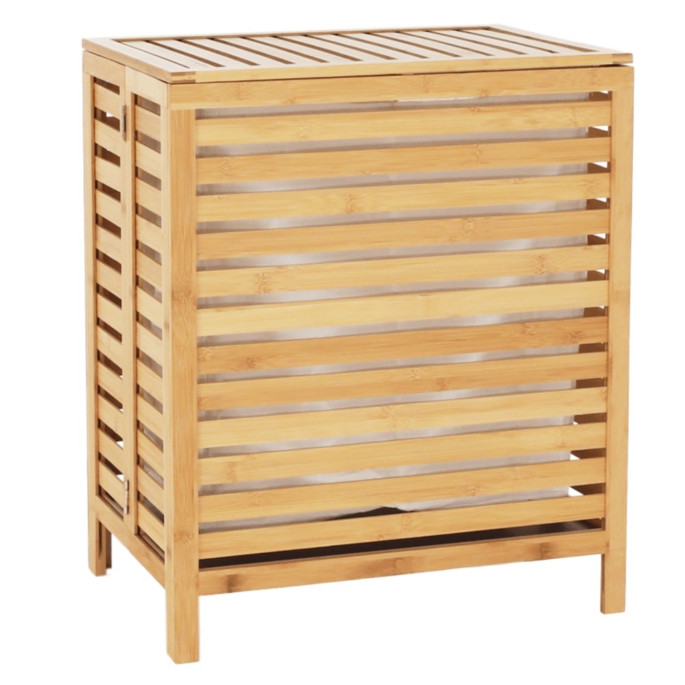 Materiál: bambus / látka Barva: přírodní Rozměry (ŠxHxV): 50x35x60 cm Vyjímatelný látkový pytel Látkové země mohou prát v pračce Objem: 105 litrů Skládací koš Odvětrávaný úložný prostor Úložný prostor rozdělený na dvě části Dodáváno v demontu