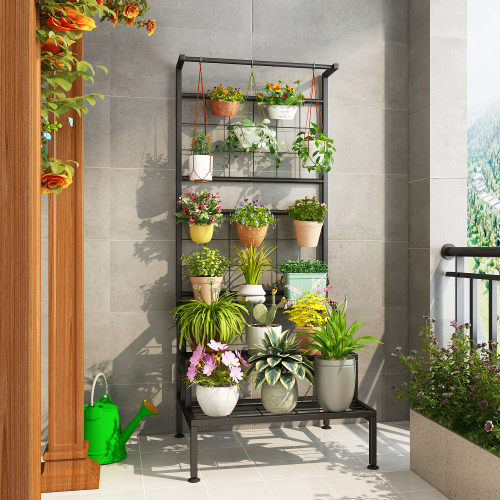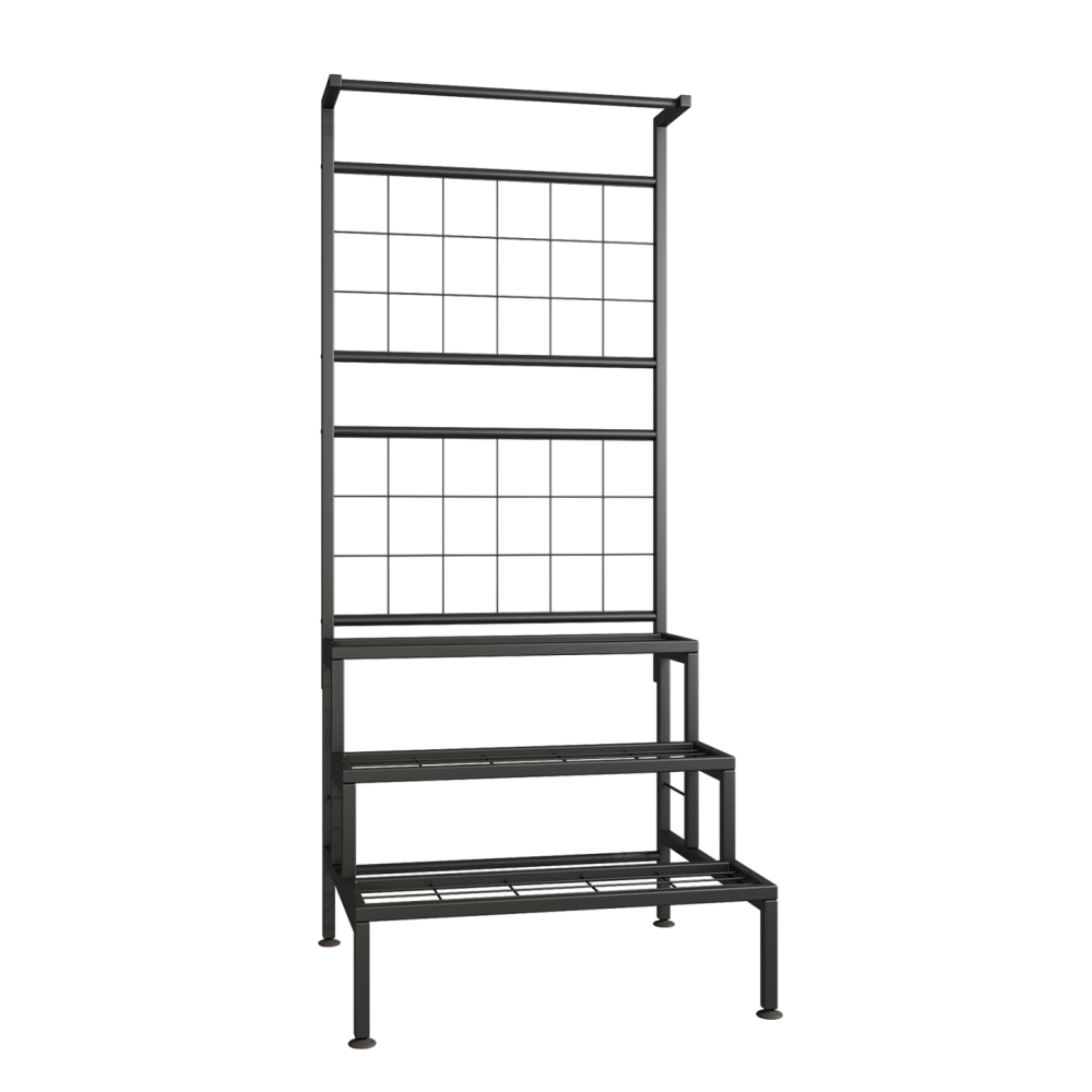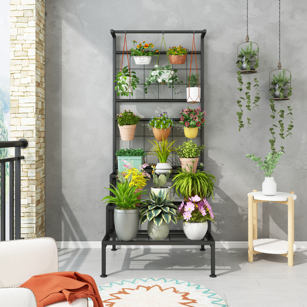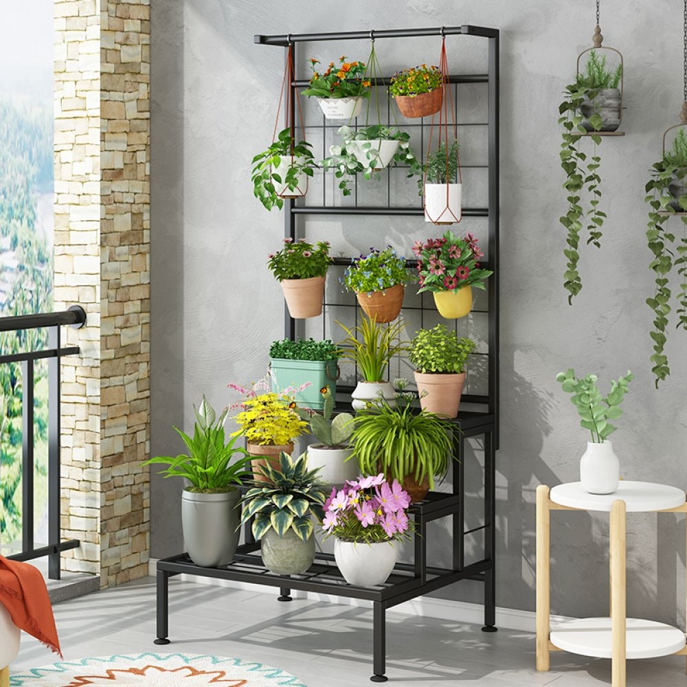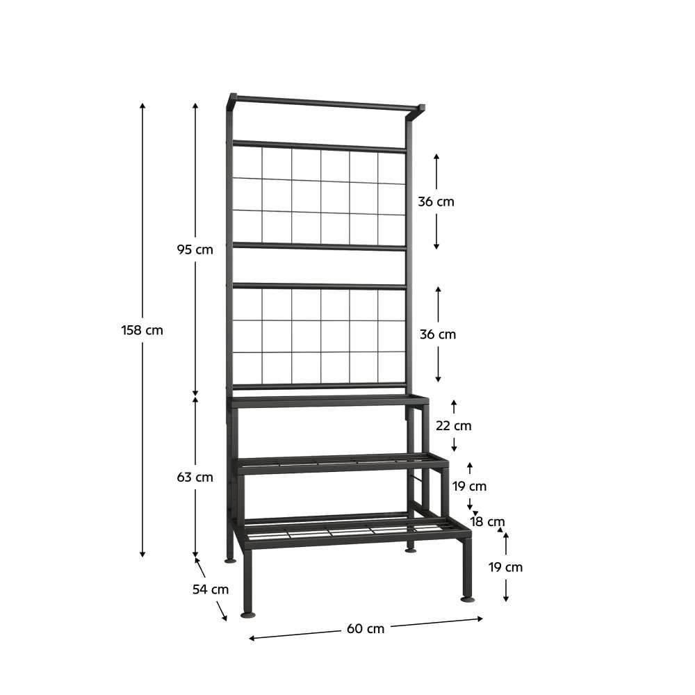 Zdůrazní krásu a jedinečnost každé květiny, která na něm najde své místo. Díky své velikosti a tvaru je stojan vhodný pro různé typy květin a rostlin. Poskytuje tři široké police, dvě části pro zavěšení a jednu tyč, také vhodnou pro zavěšení. Konstrukce je vyrobena z kovu v černé barvě . Nechte vaše květiny ukázat nádheru v celé své kráse.