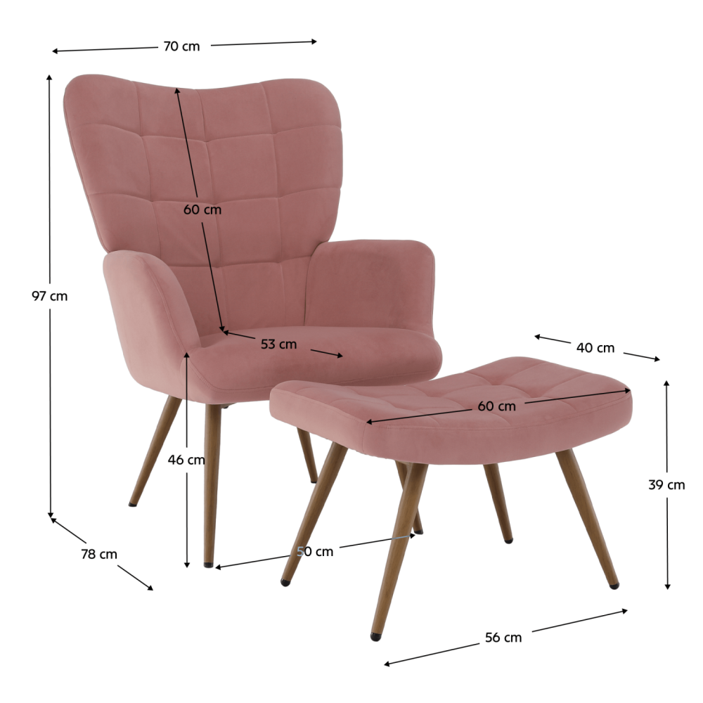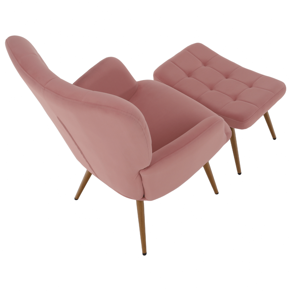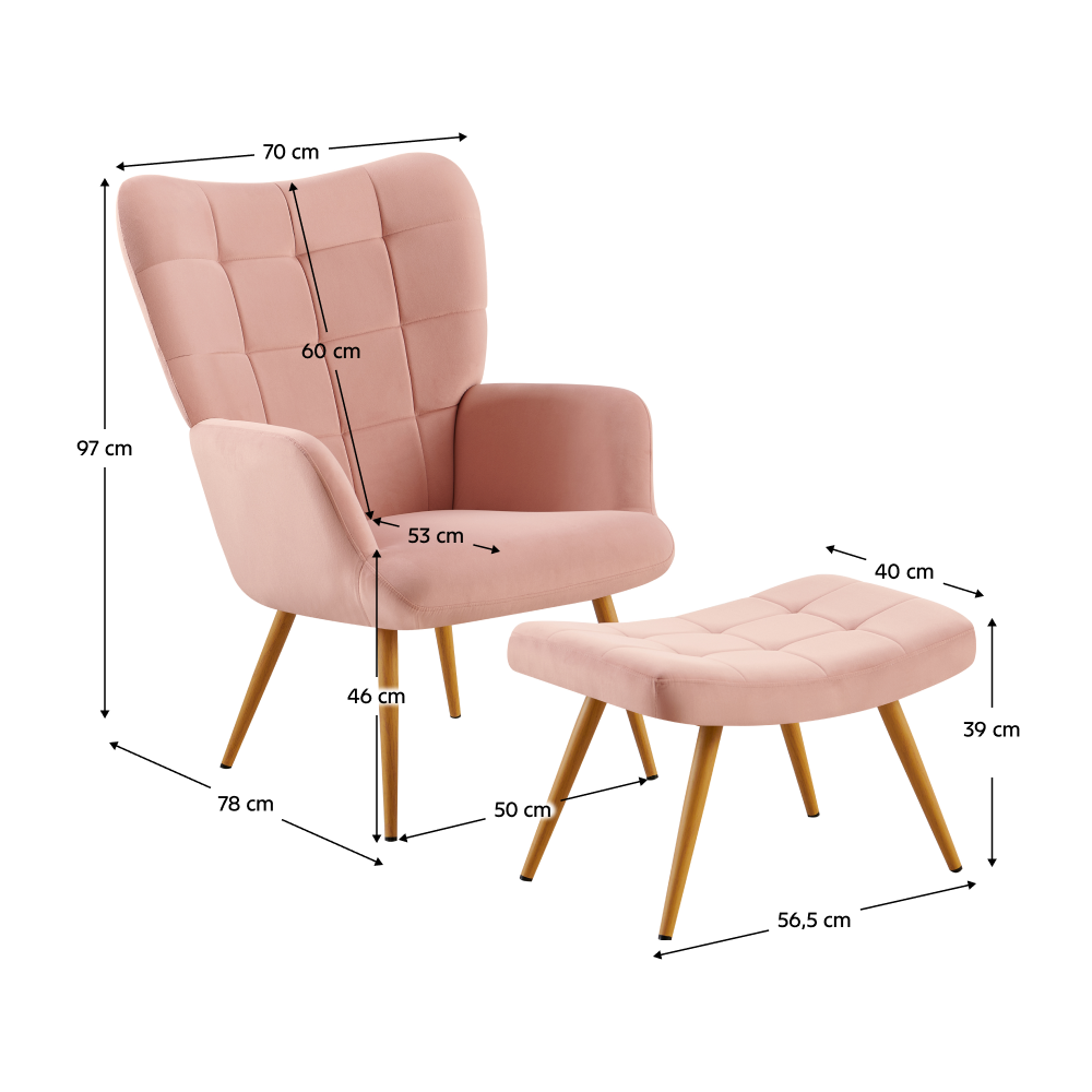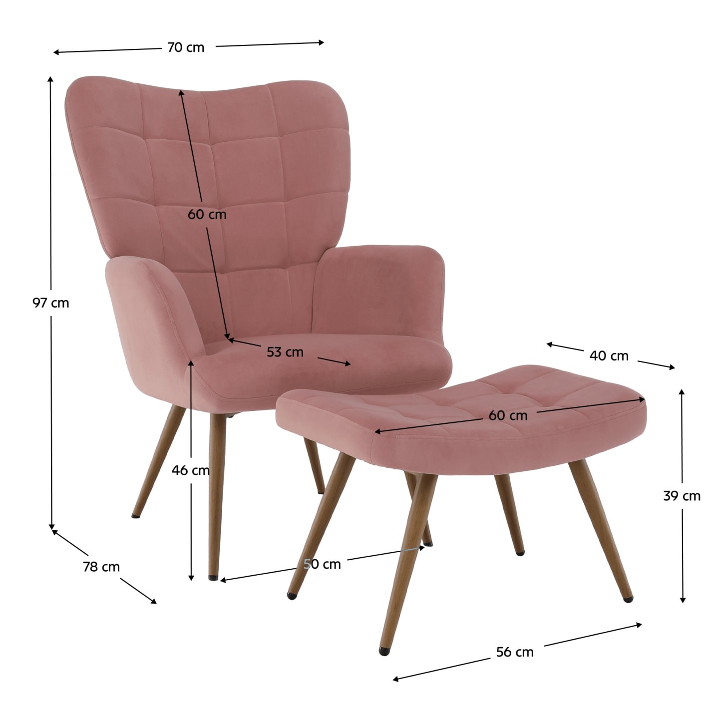 Materiál: látka Velvet 32/kov Oděruodolnost textilie podle testu Martindale: 95 000 oděrů Barevné provedení: růžová/dub Rozměry křesla (ŠxHxV): 70x78x97 cm Výška sedu: 46 cm Hloubka sedu: 53 cm Rozměry podnože (ŠxHxV): 56,5x40x39 cm Nožičky na podnožce jsou výškově nastavitelné Nosnost křesla: 90…