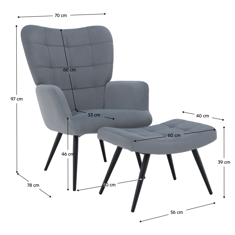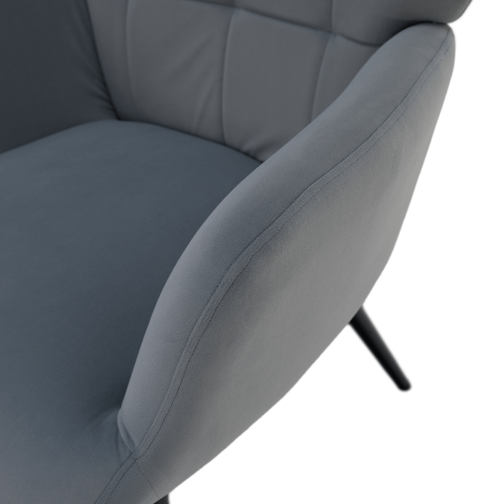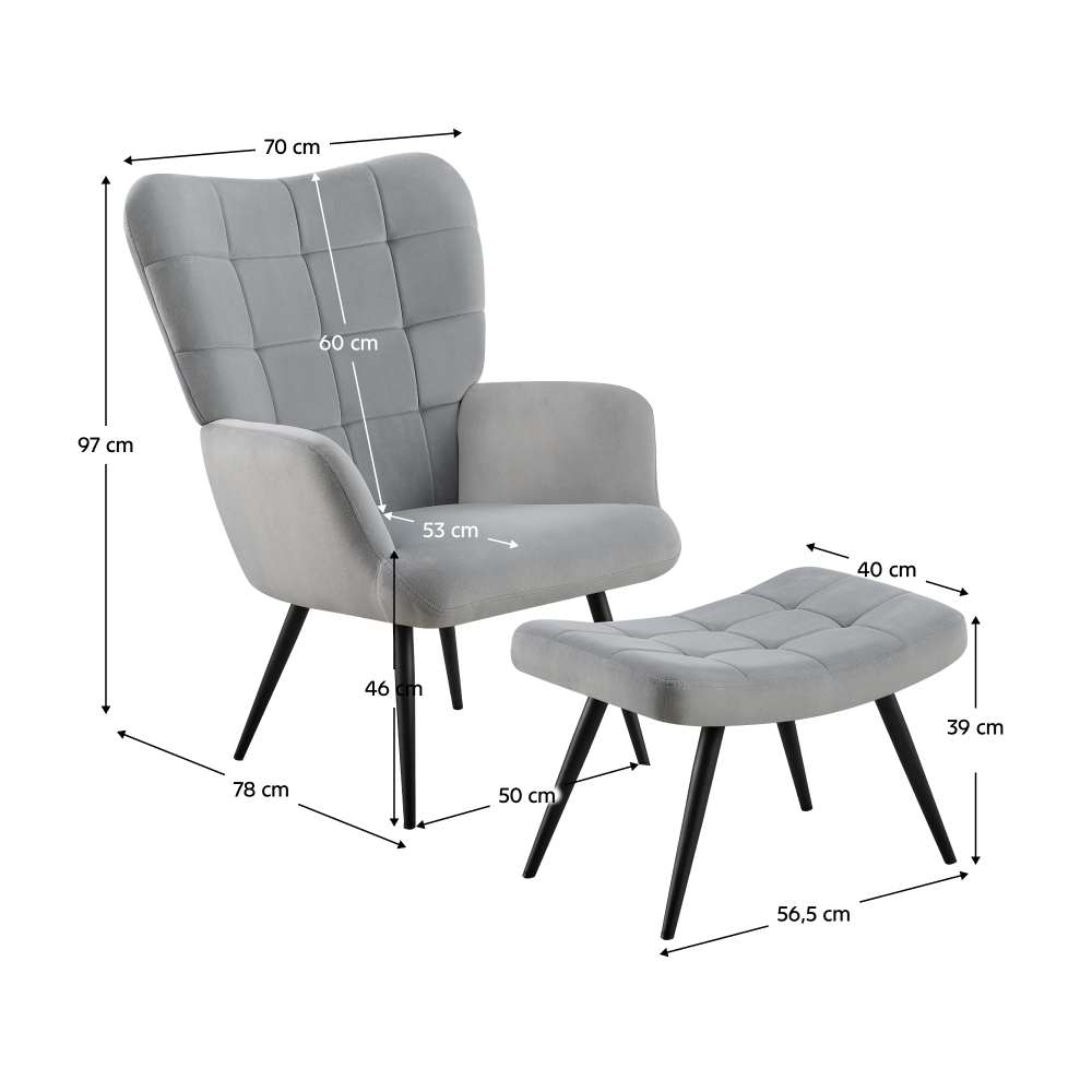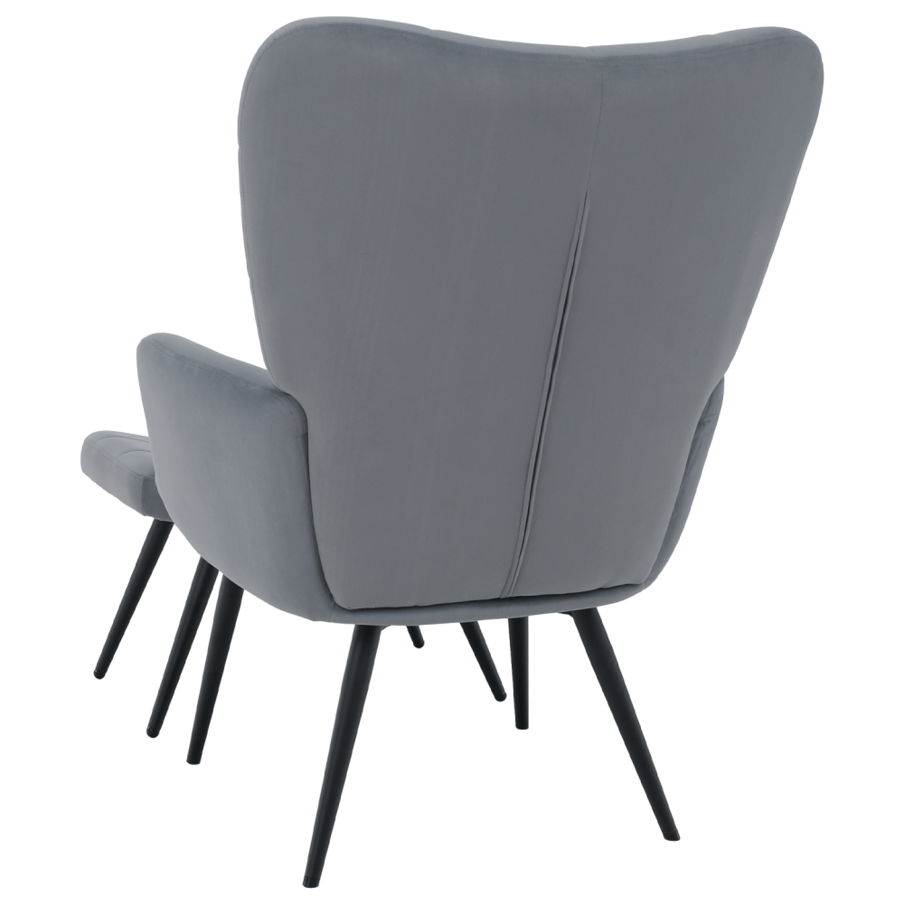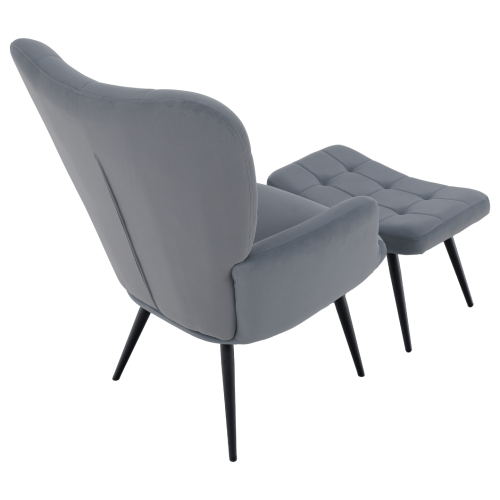 Čalouněno je kvalitní sametovou látkou Velvet v šedém barevném provedení. Dodáváno je s praktickou podnoží, která se postará o odpočinek pro vaše unavené nohy. Stabilitu křesla a podnože zajišťuje černý kov, který svojí kombinací s látkou Velvet dotváří celkový design. Opěradlová část křesla a vrch podnože jsou dekorativně prošívané. Křeslo, které bude skvělým a oblíbeným společníkem dlouhá léta.