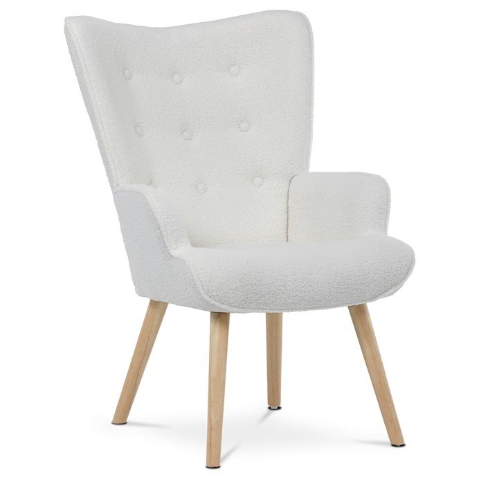 Zkrášlete svůj obývací pokoj nebo pracovnu tímto křeslem, které v sobě kombinuje bílou barvu a přírodní masivní nohy. Potah křesla je vyroben z látky bouclé s jemným povrchem. Pěnová výplň křesla Vám poskytne opravdový komfort.