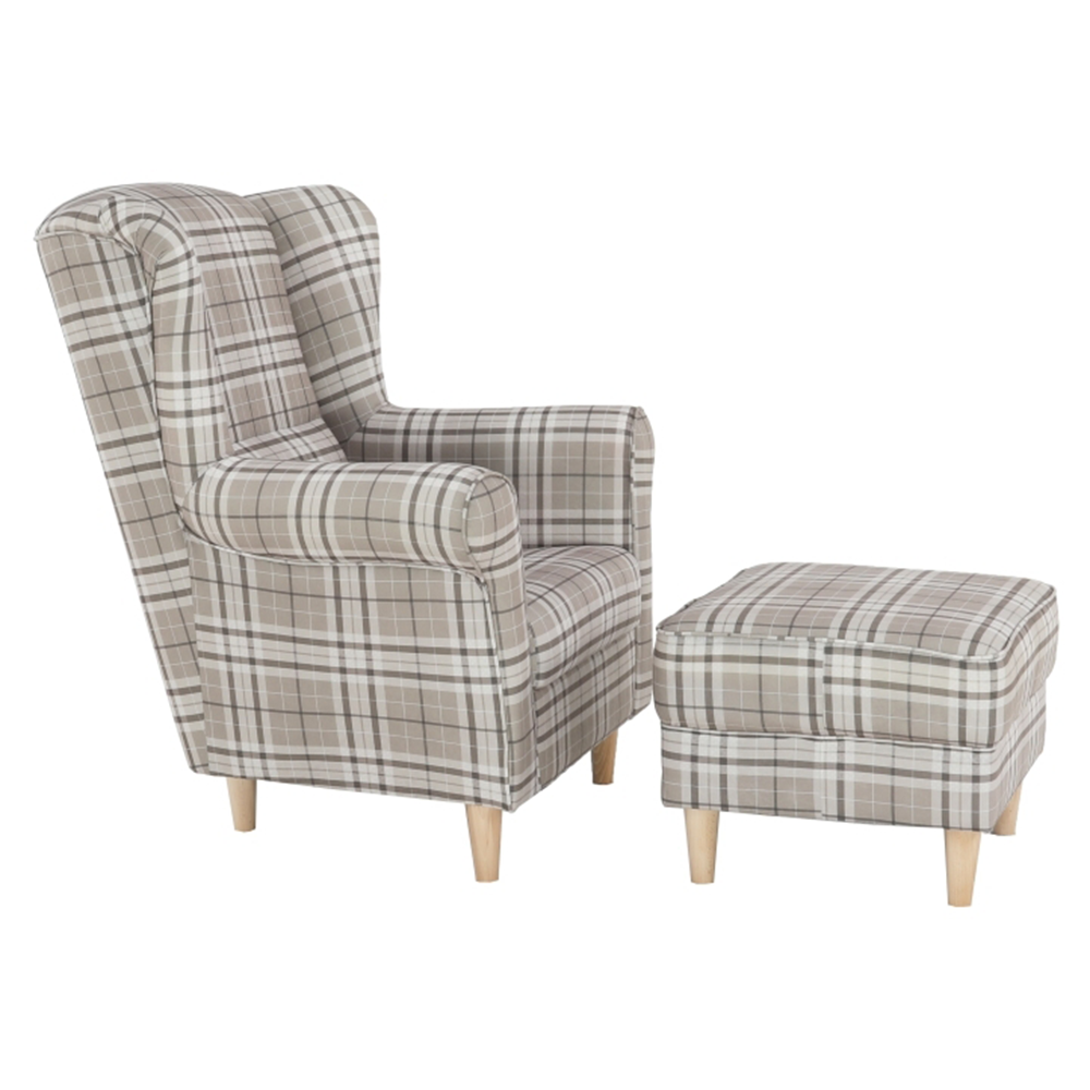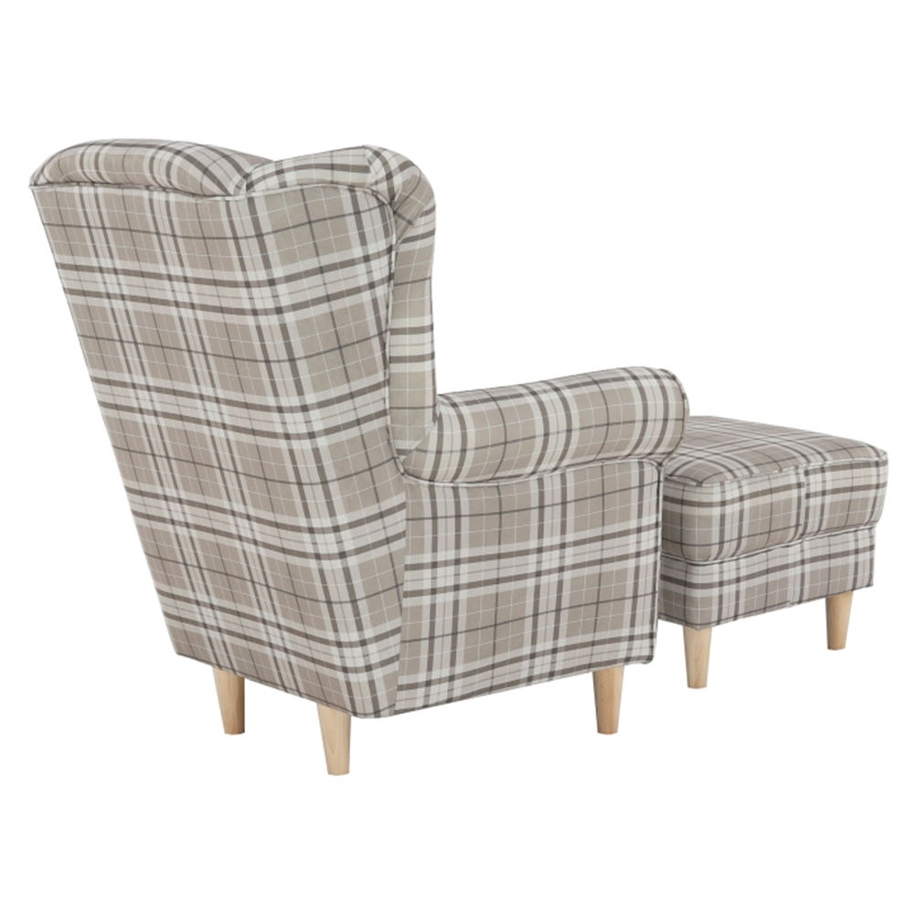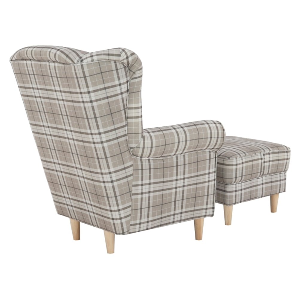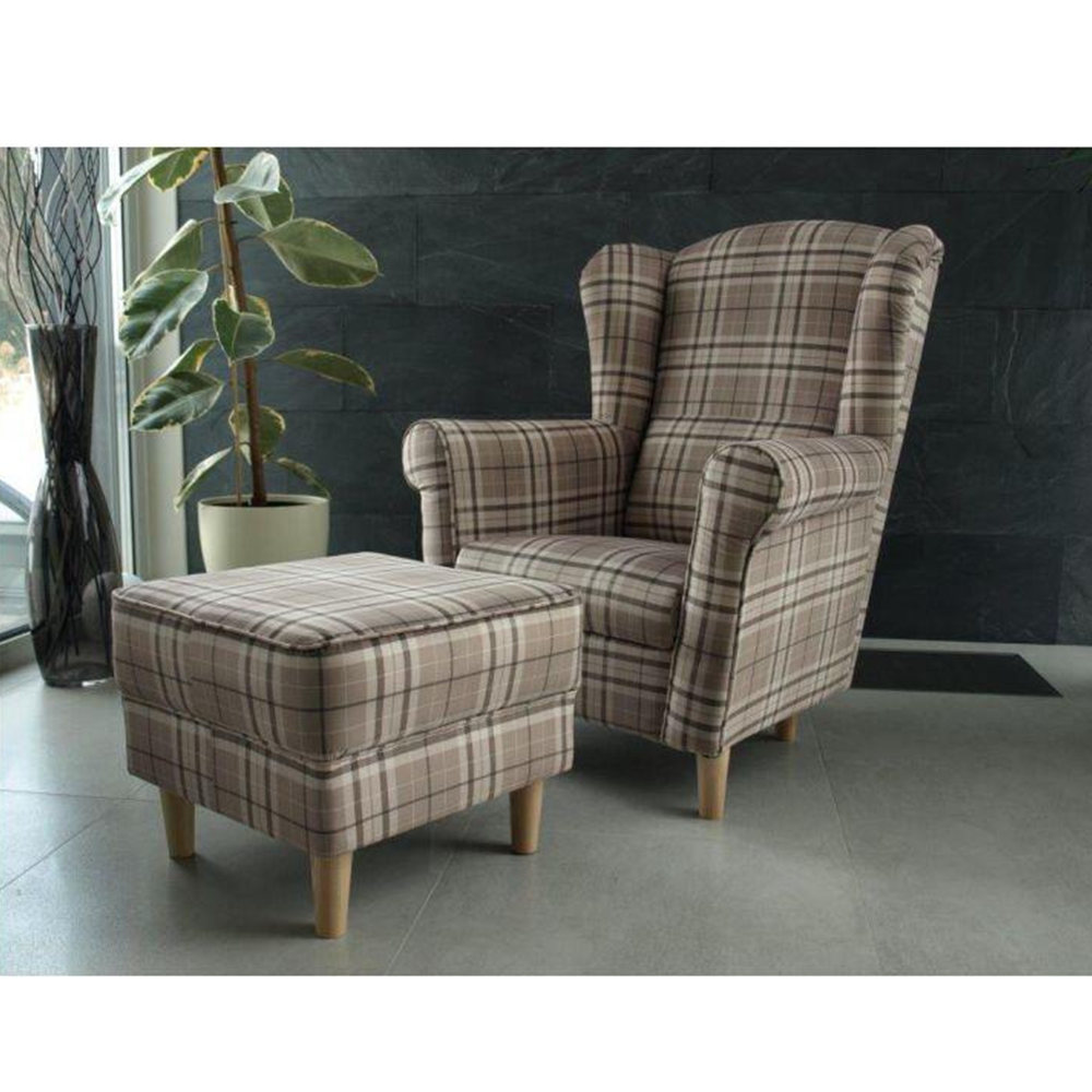 Křeslo ušák s taburetem, látka hnědé káro/buk, ASTRID