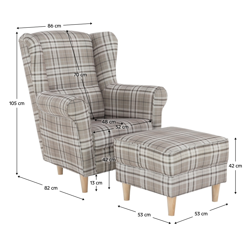 Pohodlné křeslo - ušák s taburetem ASTRID Provedení: látka hnědé káro - nožičky dřevěné v provedení buk Oděruodolnost textilie podle testu Martindale: 85 000 oděrek Rozměry (ŠxHxV): křeslo - 86x82x105 cm Výška sedu: 42 cm Hloubka sedu: 48 cm Taburet (ŠxHxV): 53x53x42 cm Výška spodního…