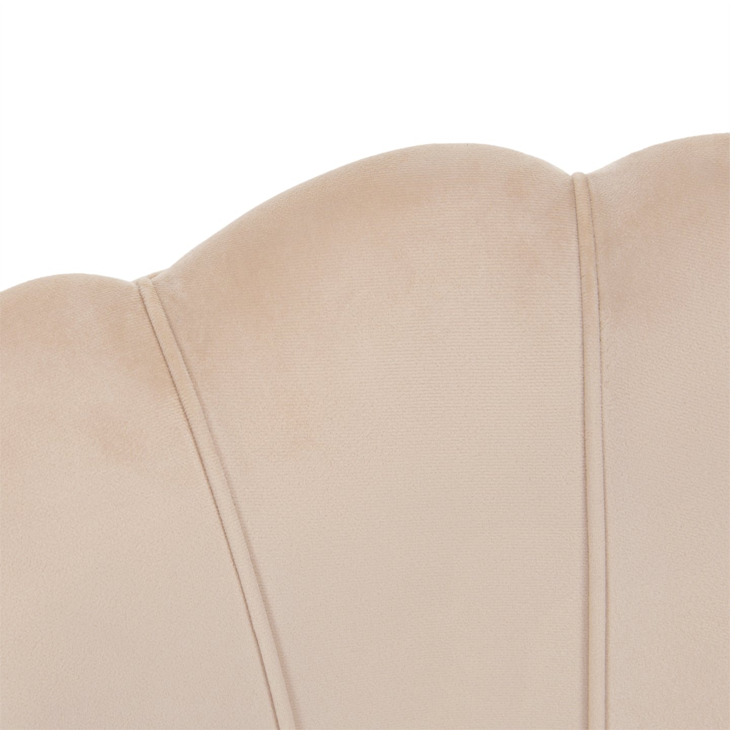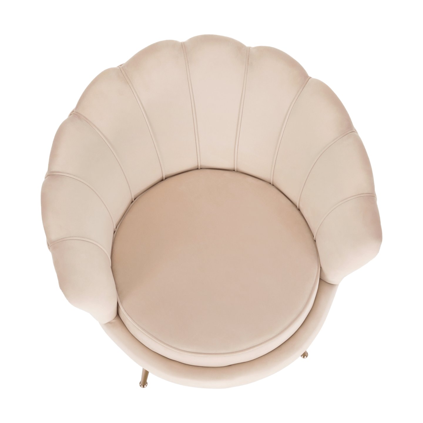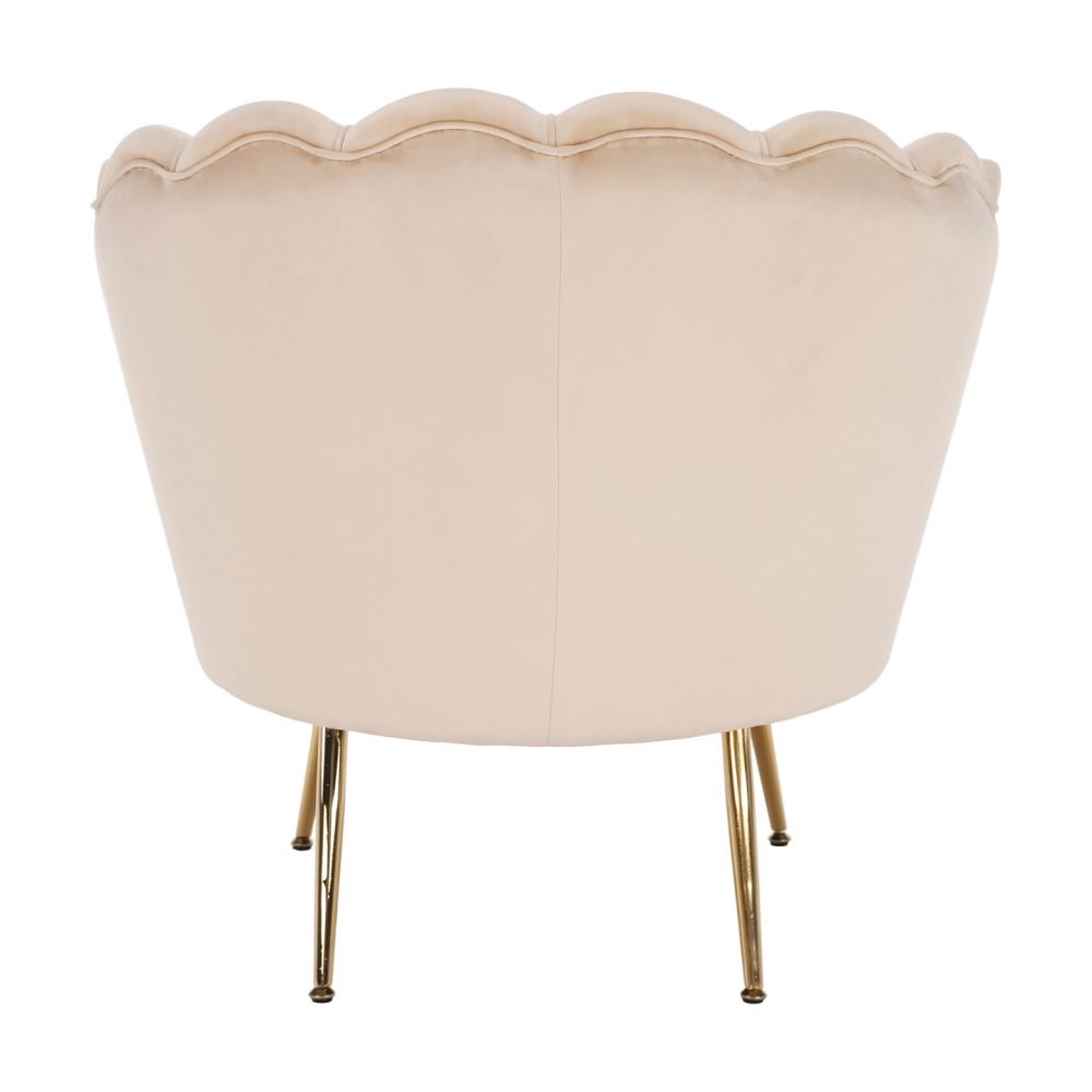 Luxusní design a oku lahodící kombinace béžové Velvet látky s gold chrom-zlatými nohami mu dodávají nádech extravagance a luxusu. Toto křeslo ohromí každého milovníka Art-deco stylu. Křeslo ve tvaru mořské mušle působí půvabně a elegantně zároveň, štíhlé kovové nohy celkový masivní vzhled příjemně odlehčují. Opěradlo je z vnitřní strany dekorativně prošité, doplněné je pohodlným sedákem. Nohy zakončují rektifikační nožičky, jejichž úkolem je zajistit stabilitu lavice na jakémkoli nerovném povrchu. Vyrovnávají nerovnosti podlahy a různých povrchů, díky čemuž se sedící nemusí obávat nestabilního sezení.