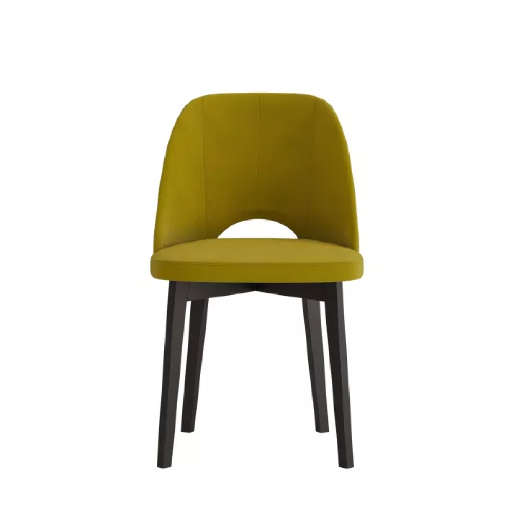 Dřevěná jídelní židle s čalouněným sedákem. Na výběr je několik odstínů látek a moření podnože (viz vzorníky níže).