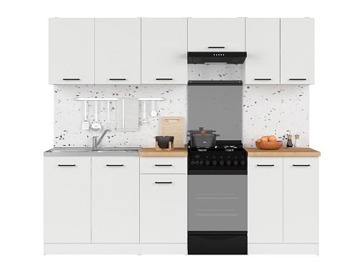 Kuchyňská sestava o šířce 230 cm vám poskytuje dostatek místa pro instalaci digestoře, dřezu a volně stojícího sporáku. Chcete-li ještě více možností, rozšiřte tuto sestavu o další prvky ze stejné kolekce a vytvořte si funkční designovou kuchyni přesně podle vašich představ.