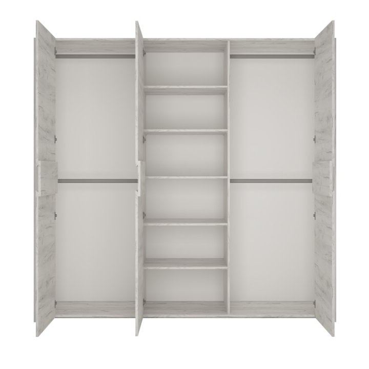 Skříň je třídveřová, rozdělena na dvě věšákové části a jednu část policovou. Ta se nachází ve střední části skříně. Věšákové části jsou pak na pravé a levé straně. Policová část je pěti policemi rozdělena na šest úložných prostorů. Dveře jsou bez úchytek, otevírají se tahem ve středové části. Postel je dodávána bez matrace a roštu. K posteli doporučujeme zakoupit matraci s rozměrem 160x200 cm a rošt s rozměrem 160x200 cm z naší nabídky.