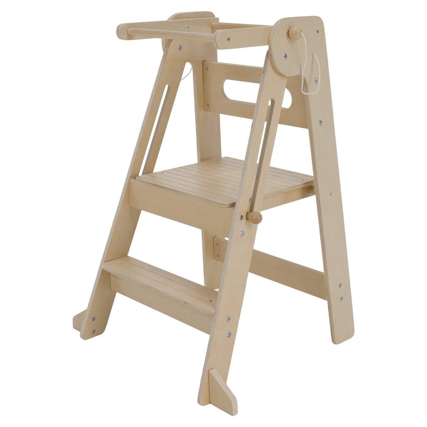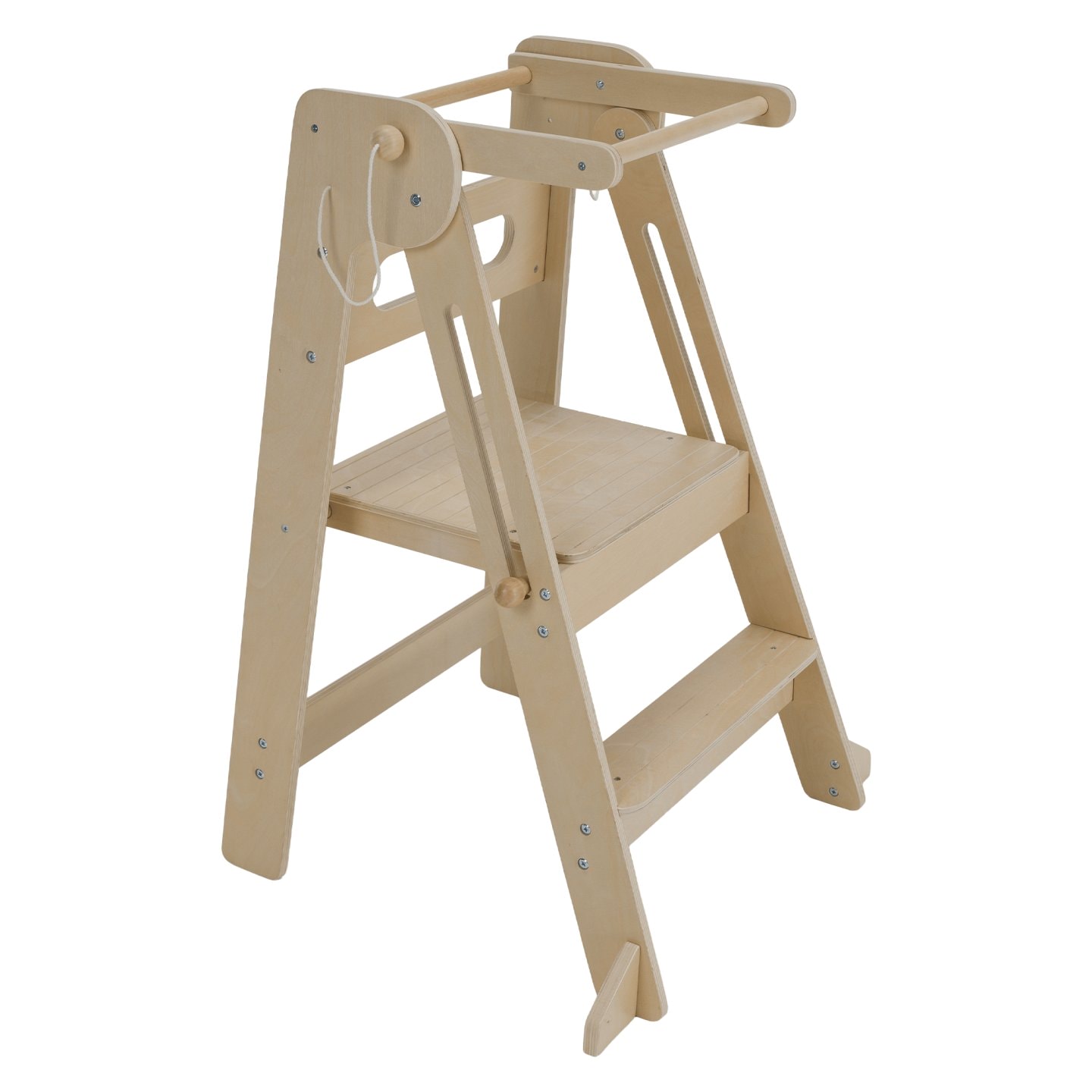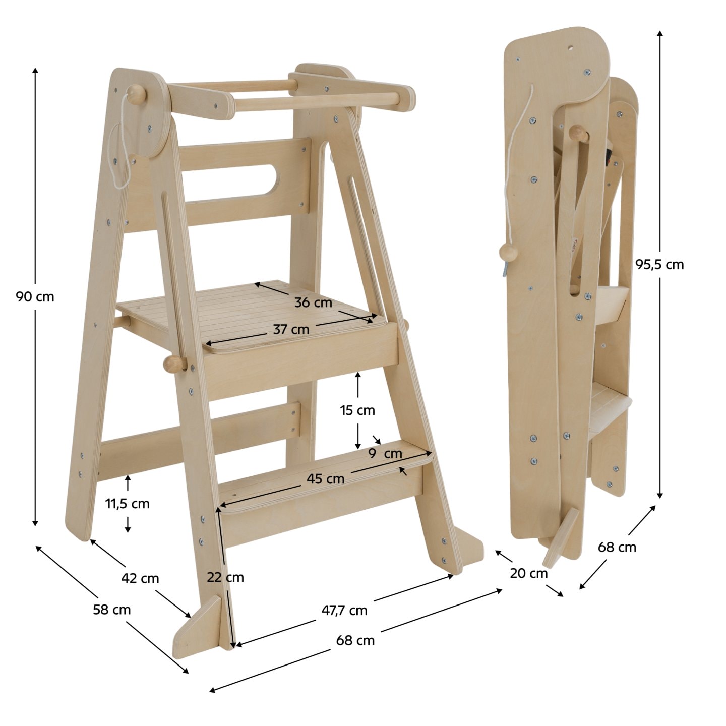Objevte dokonalého pomocníka pro zvídavé děti a aktivní rodiče. Montessori skládací učící věž URIAN v neutrálním přírodním barevném provedení otevírá dětem dveře nejen k samostatnosti, ale také k učení. Dává malým objevitelům prostor zapojit se do světa dospělých, ať už při pečení koláčů, mytí ovoce nebo čištění zoubků, čímž podporuje jejich nezávislost a sebedůvěru. Její praktická skládací konstrukce umožňuje jednoduché uskladnění, když ji zrovna nepotřebujete nebo snadnou manipulaci při přesouvání mezi místnostmi. Věž je vybavena uzamykacím mechanismem, který při otevření drží věž bezpečně na místě. Vyrobena je z překližky, která zajišťuje pevnost a stabilitu při každém kroku. Zaoblené hrany chrání děti před poraněním, přičemž celé provedení splňuje přísné bezpečnostní požadavky normy EN 14988:2017 + A1:2020. Určena je pro děti starší než jeden rok, které již dokážou stát bez pomoci. Věž URIAN je připravena stát se nepostradatelnou součástí každé moderní domácnosti.