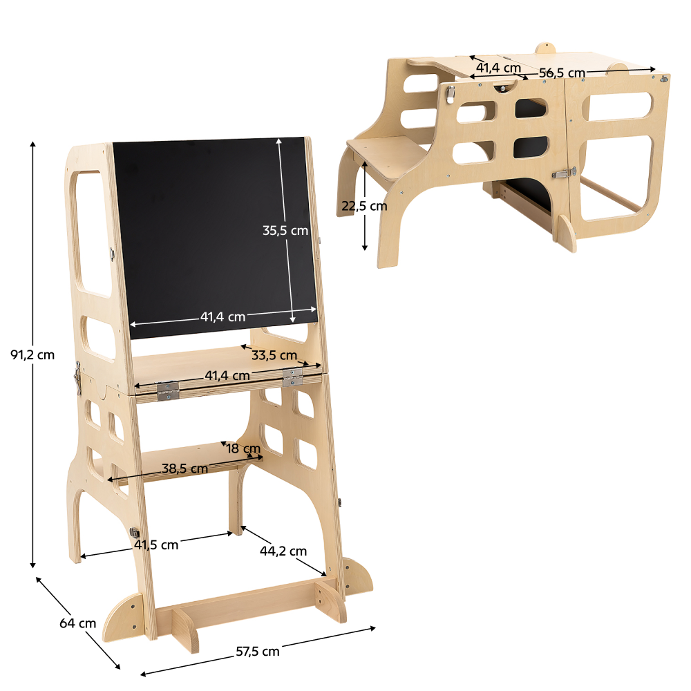 Montessori učící věž 3v1 MAGAN je mnohem víc než jen praktický pomocník. Je to hravý společník, který roste spolu s vaším dítětem a přirozeně se přizpůsobuje jeho potřebám. V jednu chvíli slouží jako bezpečná učící věž, v další se díky promyšlené konstrukci bez použití nářadí změní na stolek se židlí nebo tabulku na kreslení. Stačí jednoduše odemknout sponu, otočit a opět zajistit, abyste vytvořili nový prostor pro tvořivost, učení nebo společné chvíle. Zaoblené hrany chrání malé rukojeti, zatímco kvalitní kombinace masivního borovicového dřeva a překližky zaručuje stabilitu a dlouhou životnost. V přírodním provedení se dokonale hodí do každé domácnosti, kde rodiče chtějí svým dětem dopřát nejen funkční, ale také esteticky příjemný doplněk. Věž podporuje samostatnost a umožňuje dětem aktivně se zapojit do každodenních rodinných aktivit. Je určena pro děti starší jednoho roku, které již dokážou samostatně stát. Splňuje všechny bezpečnostní normy EN 14988:2017 + A1:2020. Věž MAGAN se může stát oblíbenou součástí vašeho domova.