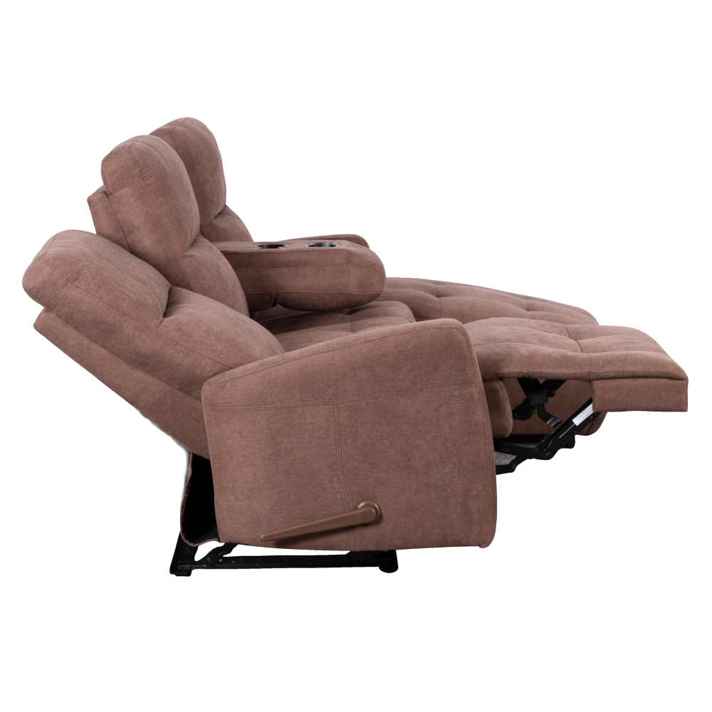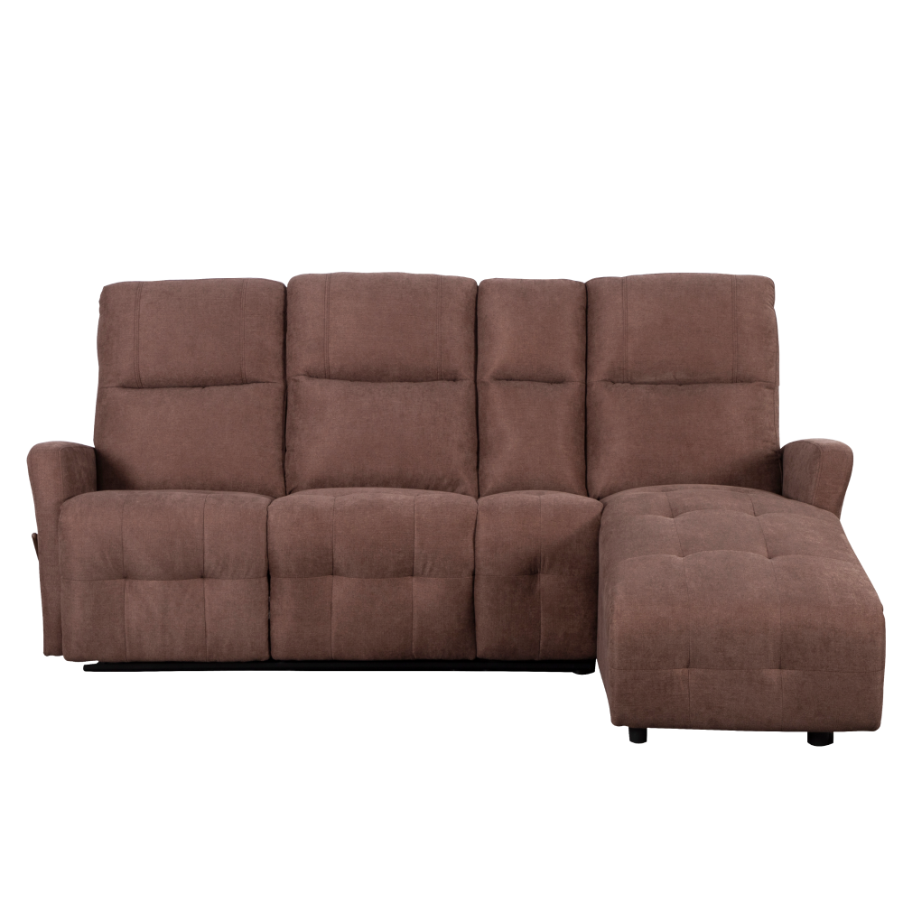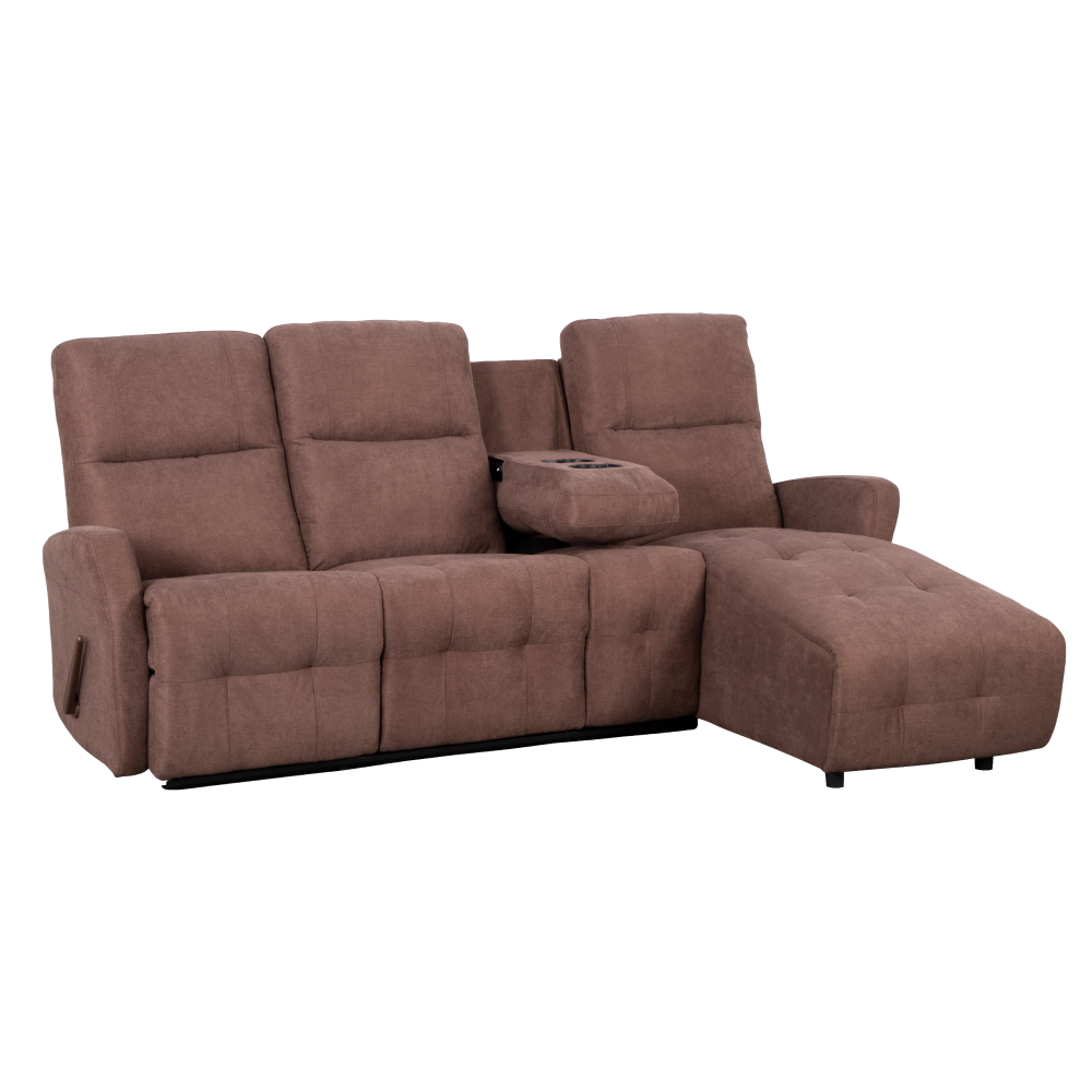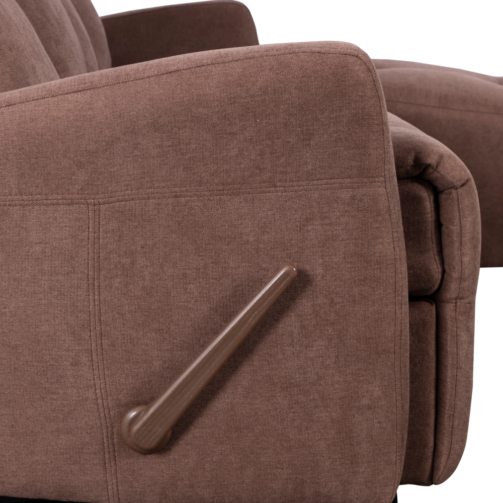 Rohová sedačka je čeločalouněna tmavě hnědou látkou, proto ji můžete klidně umístit doprostřed místnosti. Výhodou sedačky je i sklápěcí držák na občerstvení, který se nachází mezi otomanovou částí a dvousedem. Podnož vysunete pomocí páčky na boční straně sedací soupravy. Opěradlo sklopíte jemným potlačením dozadu. Když opět zatlačíte, opěradlo se vrátí do původní polohy. Podnož sklopíte tak, že do ní zatlačíte nohama. Polohuje se jen levá část dvojsedu, ostatní části jsou pevné. Výplň sedací soupravy TROJAN ROH tvoří kvalitní vlnovcová pružina v kombinaci s PUR pěnou.