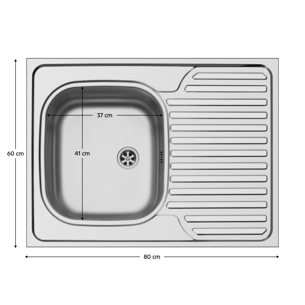 Materiál: nerez Vnější rozměry (ŠxH): 80x60 cm Vnitřní rozměry (ŠxHxV): 37x41x12 cm Tloušťka: 0,8 mm Univerzální Hladký Obdélníkový Hmotnost dřezu: 4 kg V ceně: úchytky a sifon