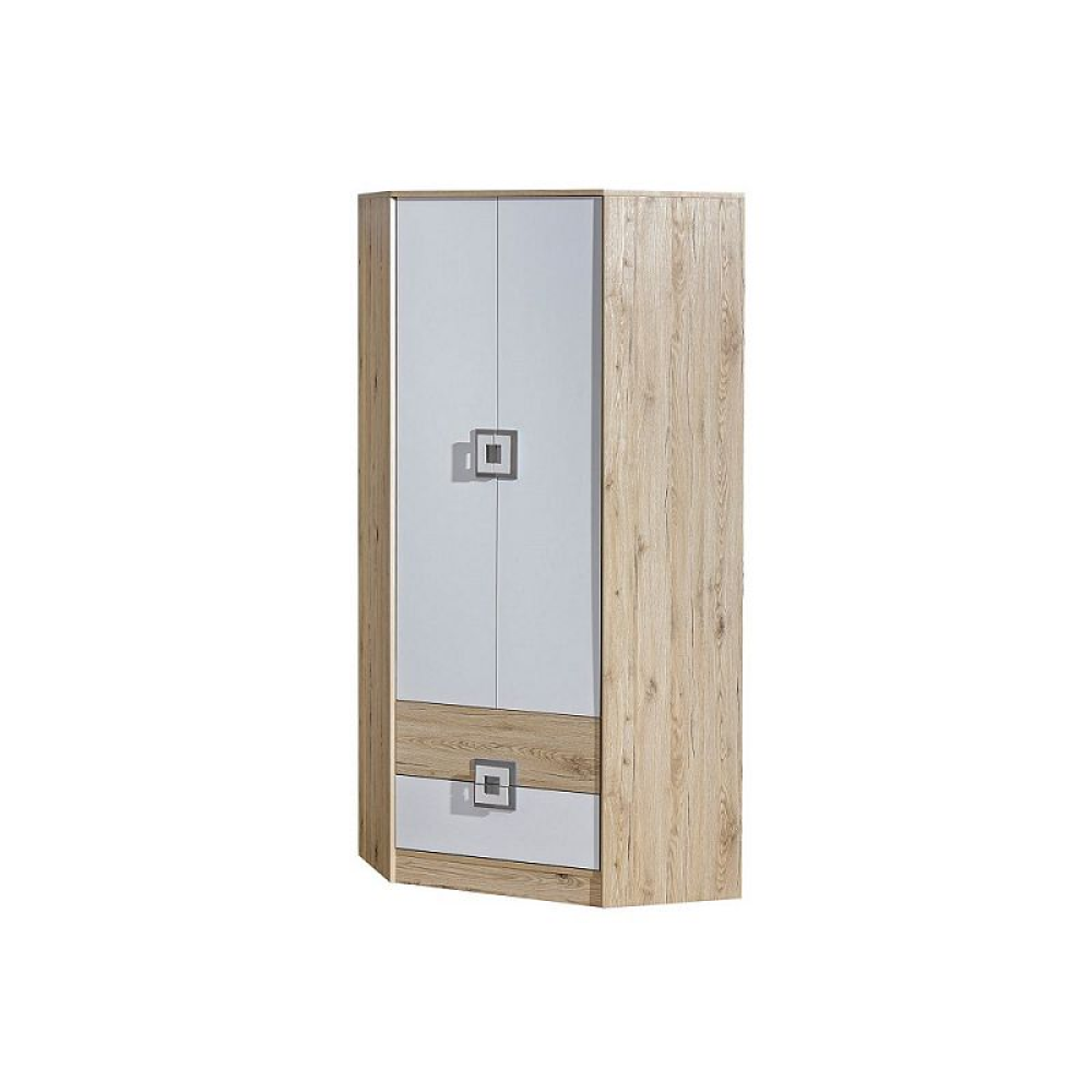 Rohová šatní skříň Nikolas 2 je vyrobena z lamina ve světlých tónech bílá/dub jasný. Úchyty byly zvoleny v