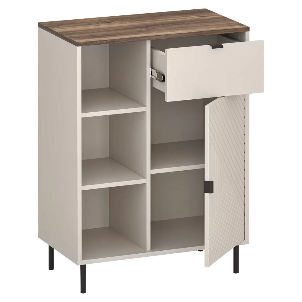 Nízký otevřený regál EYCO 1D1S nabízí svůj úložný prostor v podobě jedné skříňky, jedné zásuvky a otevřeného úložného prostoru s policemi. Za dvířky se nachází police, která předěluje úložný prostor.