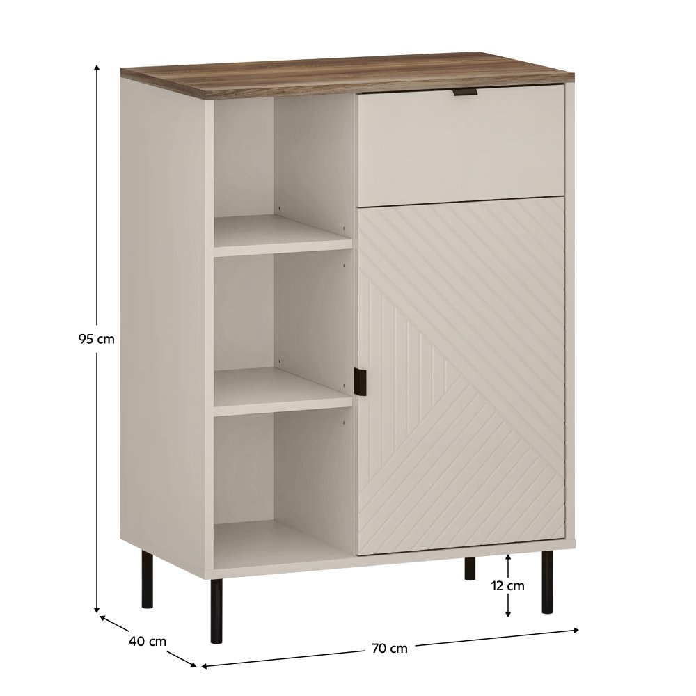 Materiál: laminovaná DTD/fóliovaná MDF/ABS hrany Barva: kašmír/dub castello Rozměry (ŠxHxV): 70x40x95 cm Tloušťka materiálu: 1,6 cm Jednodveřový Jedna skříňka Jedna zásuvka Otevřený úložný prostor Police S úchytkami Materiál úchytek: kov Barva úchytek: černá Na nožičkách Materiál nožiček: kov Barva…