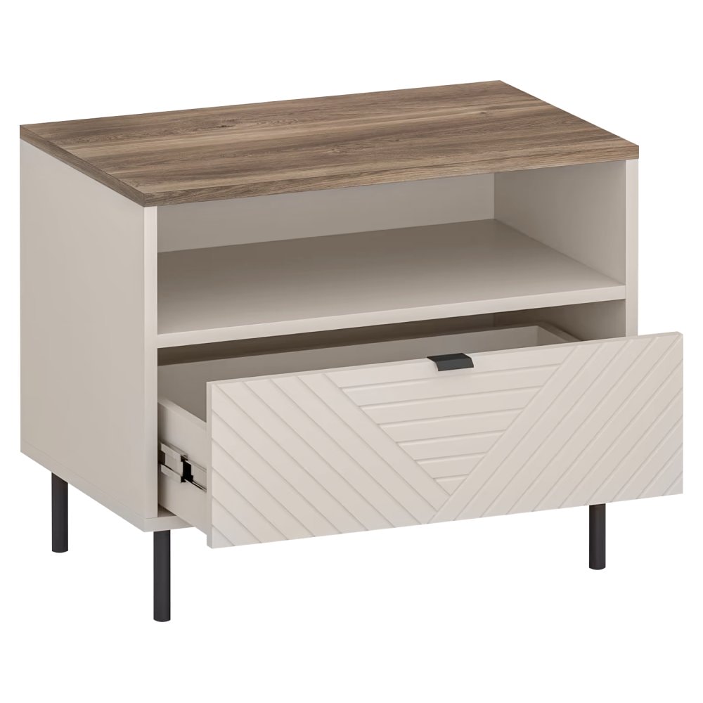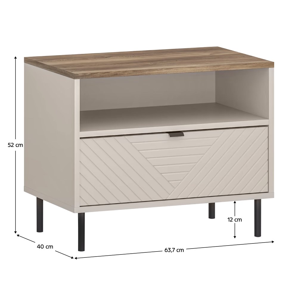 Materiál: laminovaná DTD/fóliovaná MDF/ABS hrany Barva: kašmír/dub castello Rozměry (ŠxHxV): 63,7x40x52 cm Tloušťka materiálu: 1,6 cm Jedna zásuvka Otevřený úložný prostor Police S úchytkami Materiál úchytek: kov Barva úchytek: černá Na nožičkách Materiál nožiček: kov Barva nožiček: černá Výška…