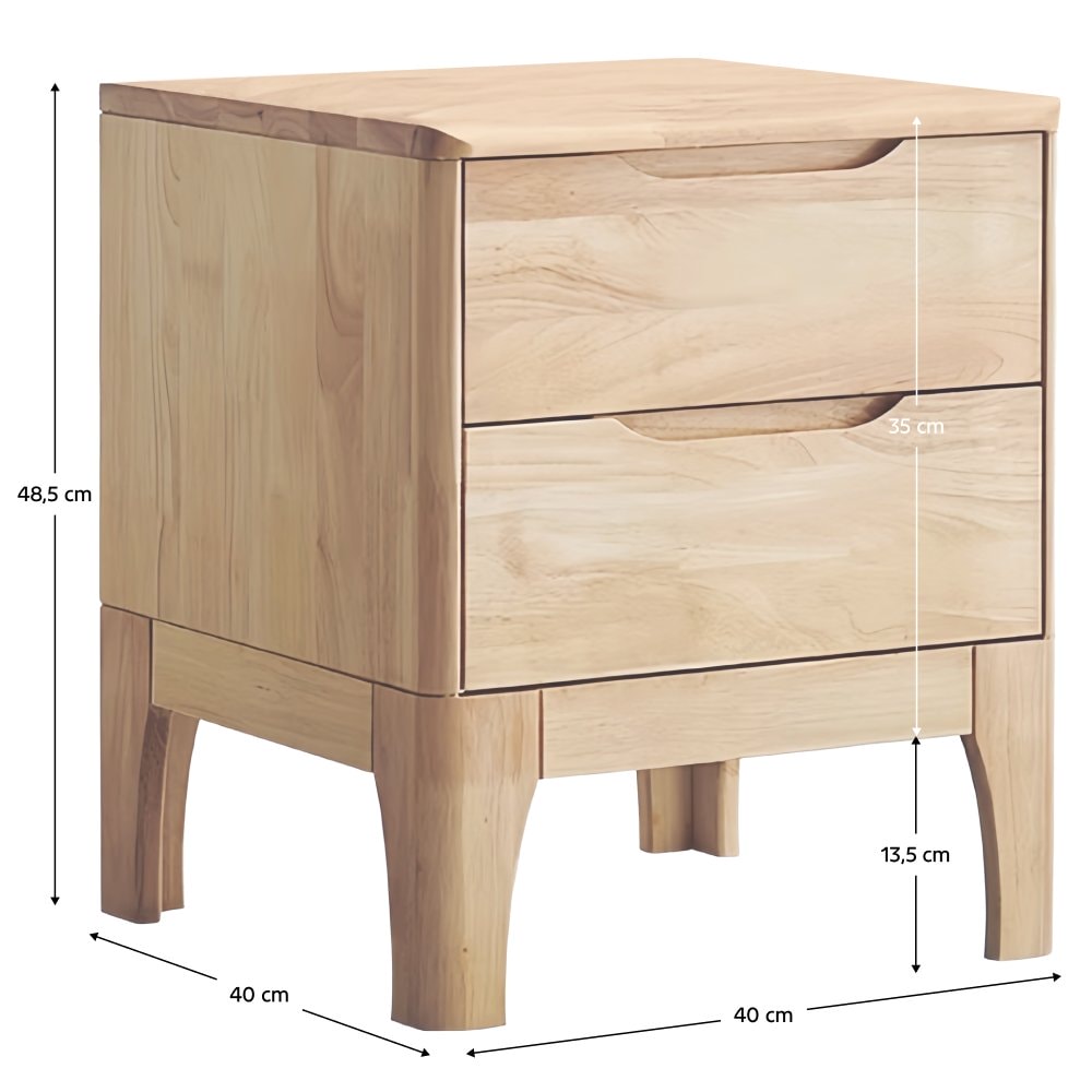 Materiál: kaučukové dřevo/borové dřevo Barva: přírodní Rozměry (ŠxHxV): 40x40x48,5 cm Výška stolku: 35 cm Dva šuplíky Na nožičkách Materiál nožiček: kaučuk Barva nožiček: přírodní Výška nožiček: 13,5 cm Zafrézované úchytky Nosnost: 4 kg Dodáváno v monte