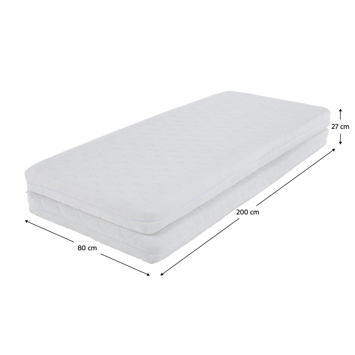 Materiál: vysokoelastická PUR pěna/potah Rozměry (ŠxD): 80x200 cm Výška matrace: 27 cm Rozkládací Rozměry rozkladu (ŠxD): 160x200 cm Výška matrace po rozkladu: 13,5 cm Nosnost na osobu: 90 kg Tvrdost matrace: H3 středně tvrdý Hustota pěny: T25 Antialergický Oboustranný Snímatelný potah Pratelný…