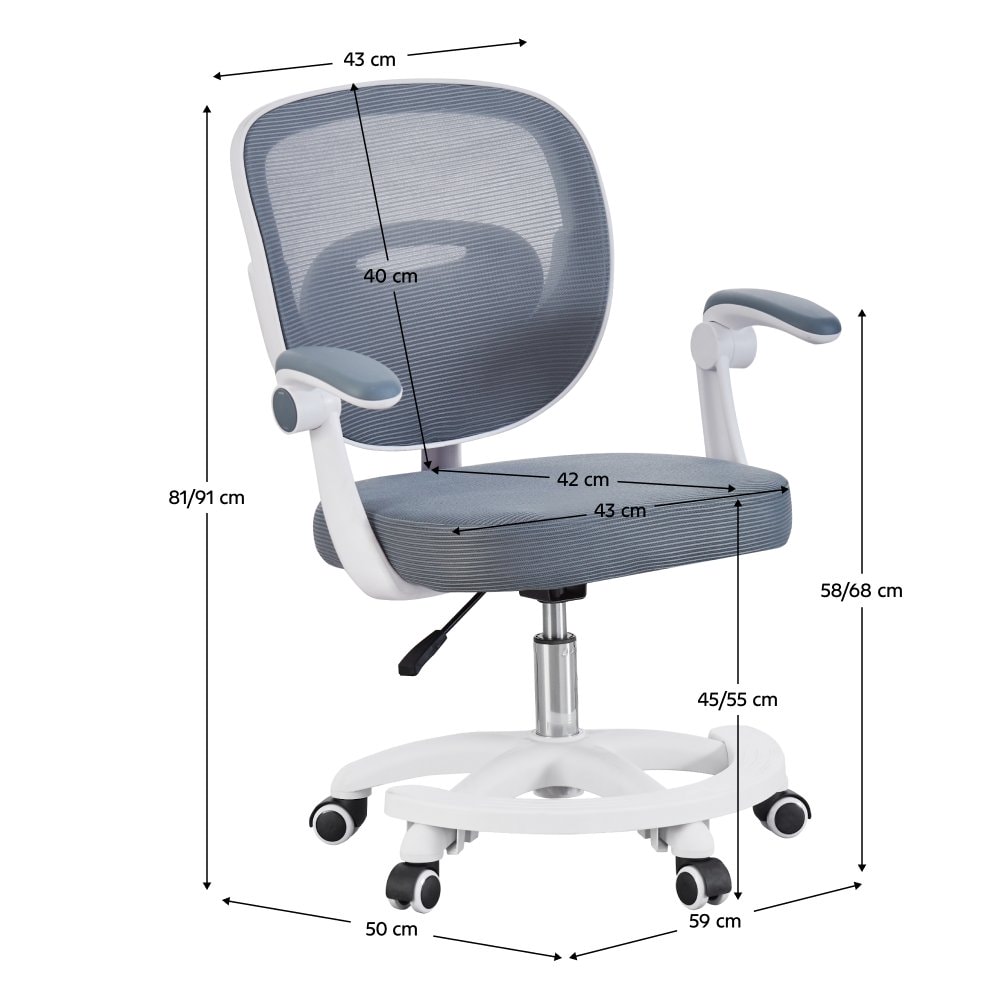 Zaujme svým skvělým vzhledem a vyniká praktickými vlastnostmi. Díky možnosti nastavení výšky sedu si židličku jednoduše přizpůsobíte podle svých potřeb vašeho dítěte, zatímco podstava slouží jako podnožka na nohy. Čalouněné sklápěcí opěrky na ruce poskytují pohodlnou podporu při práci a zároveň usnadňují zasunutí židle pod stůl, čímž šetří místo. Potah sedáku a opěrky zad je vyroben ze síťoviny v šedém barevném provedení. Podstava je vyrobena z bílého plastu a doplněna je o univerzální kolečka, která jsou vhodná na tvrdé i měkké podlahy, což zajišťuje plynulý pohyb. Židle TRIXI nabízí nejen moderní design, ale také bezpečnost a komfort, což ji činí ideální pro každodenní používání.