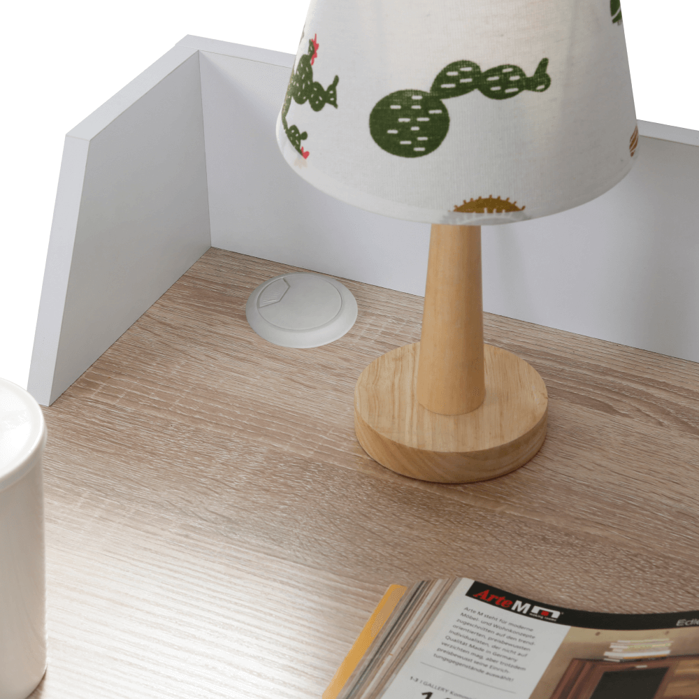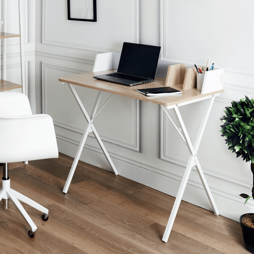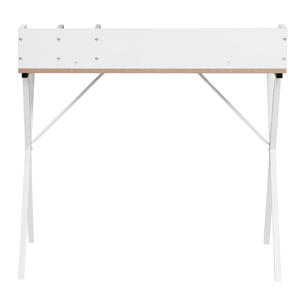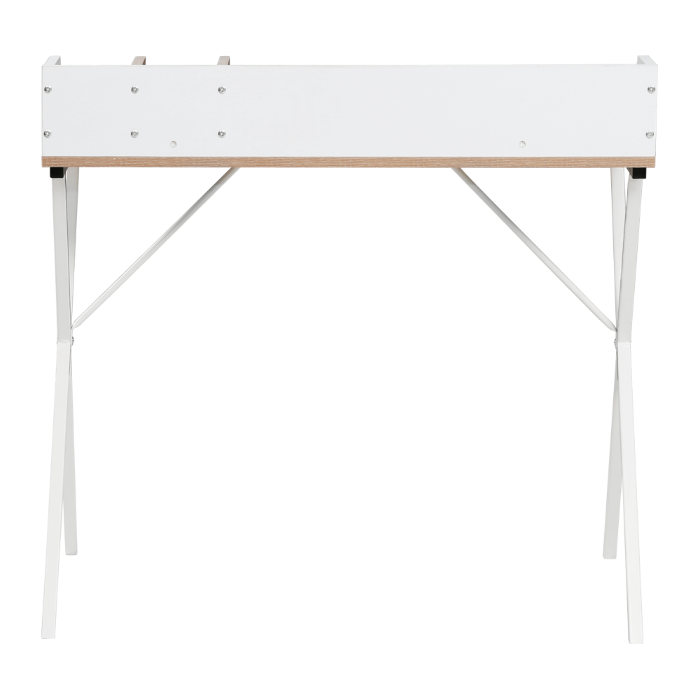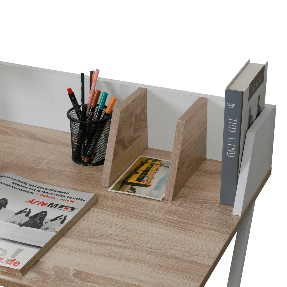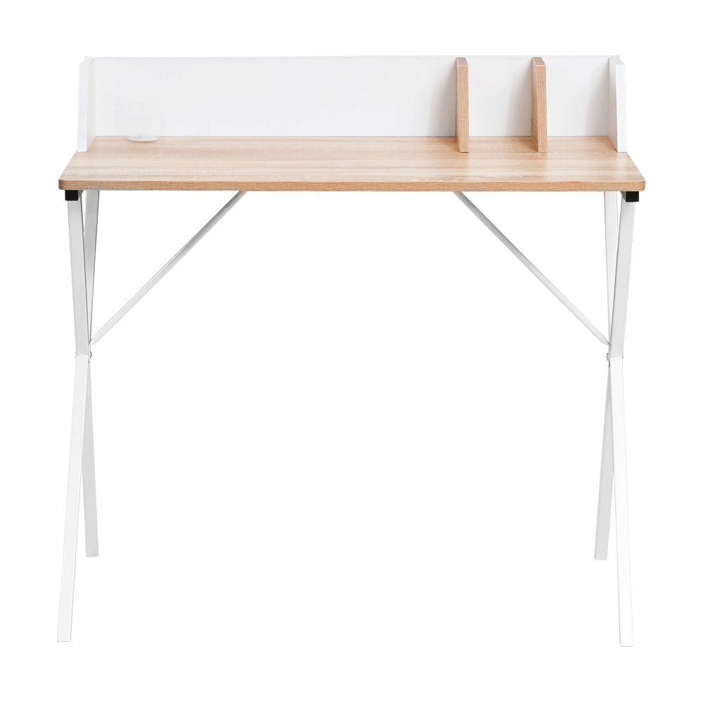 Nabízí prostornou pracovní plochu pro notebook, knihy, psací potřeby nebo stolní lampu. Pro usnadnění práce má také otvor pro kabely a několik organizérů na stolové desce, kam můžete umístit dokumenty, spisy nebo kancelářské potřeby. Vyroben je z laminované DTD v provedení dub světlý . Jeho konstrukce je vyrobena z kovu v bílé barvě. Disponuje také vyvýšenou zádí, která zabraňuje padání příslušenství a předmětů ze stolu. Díky svému jednoduchému designu se hodí do každého moderního interiéru a nabízí pohodlné místo pro práci, studium nebo zábavu.