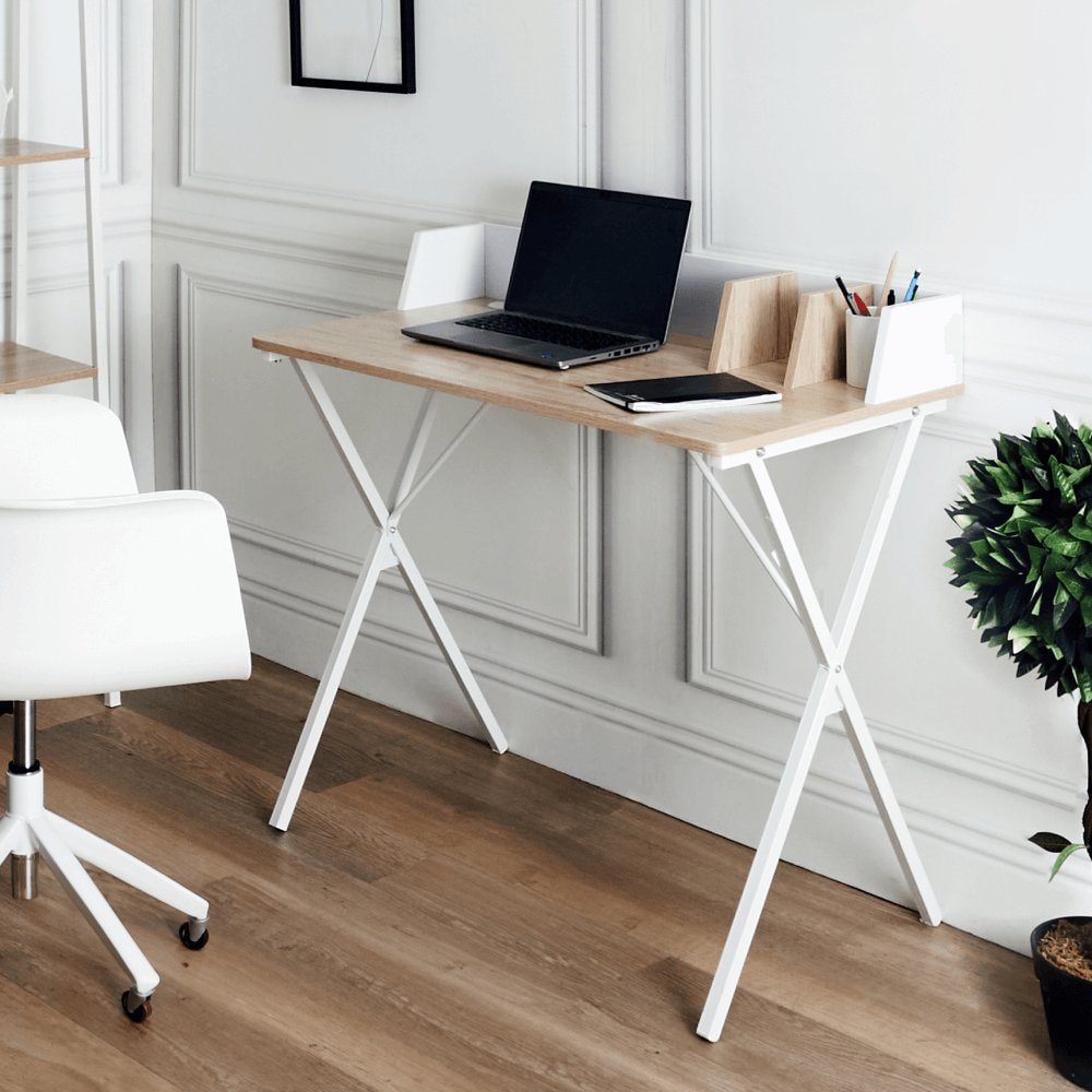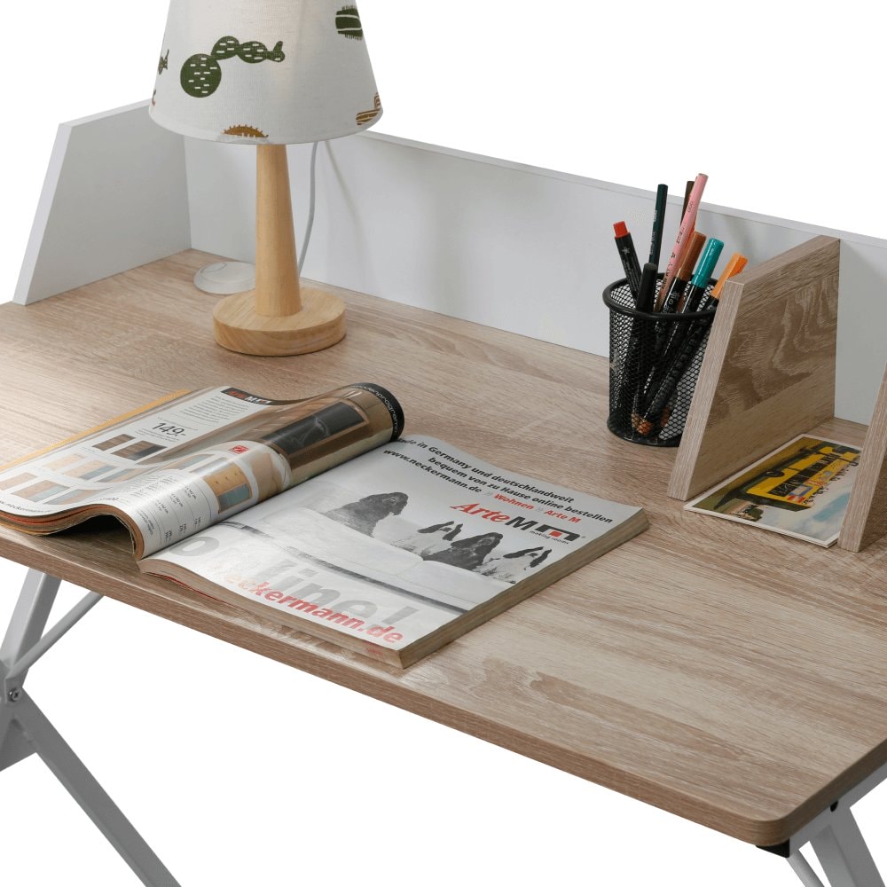 Materiál deska: DTD laminovaná/kov Barva: dub světlý/bílá Rozměry (ŠxHxV): 90x50x85 cm Tloušťka materiálu: 1,5 cm Nosnost: 40 kg Vyvýšená zadní část Otvor na kabely Průměr otvoru pro kabely: 5 cm Organizér na stolové desce Moderní design Víceúčelový stůl Univerzální využití Pracovní/psací stůl…