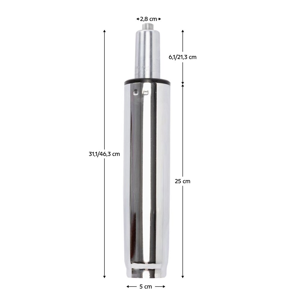 Materiál: kov Barva: chrom Průměr pístu: 5 cm Průměr pístnice: 2,8 cm Celková délka pístu: 46,3 cm Délka těla pístu: 25 cm Prodloužení: 15,2 cm Síla pístu: 300 N Nosnost: max. 150 kg Hmotnost: 0,9 kg Náhradní plynový píst Pro kancelářská křesla Pro kancelářské židle Pro otočné židle