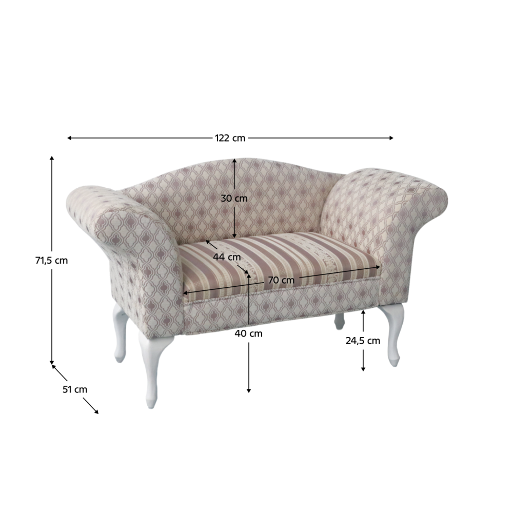 Materiál: látka/dřevo Barva: krémová/šedá/bílá Rozměry (ŠxHxV): 122x51x71,5 cm Výška sedu: 40 cm Šířka sedu: 70 cm Hloubka sedu: 44 cm Výška nožičky: 24,5 cm Výška opěrky na záda: 30 cm Hloubka opěrky na ruce: 50 cm Nosnost: 90 kg Dřevěné nožičky Pěnová výplň Dodáváno v demontu