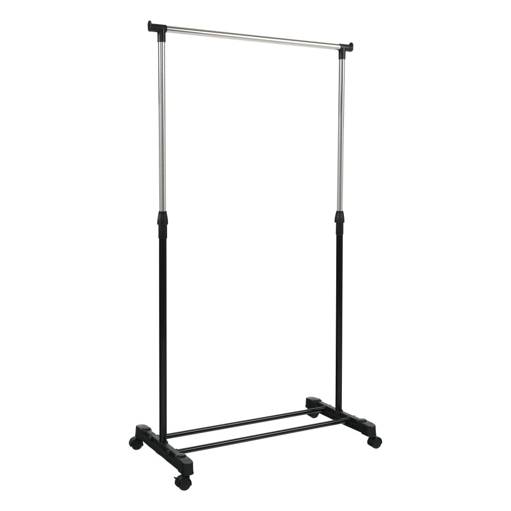 pojazdný věšák s kolečky a jednou závěsnou výškově nastavitelnou tyčí, provedení: nerezový kov + černý plast, rozměry ŠxHxV: 75,5x43x92-159 cm