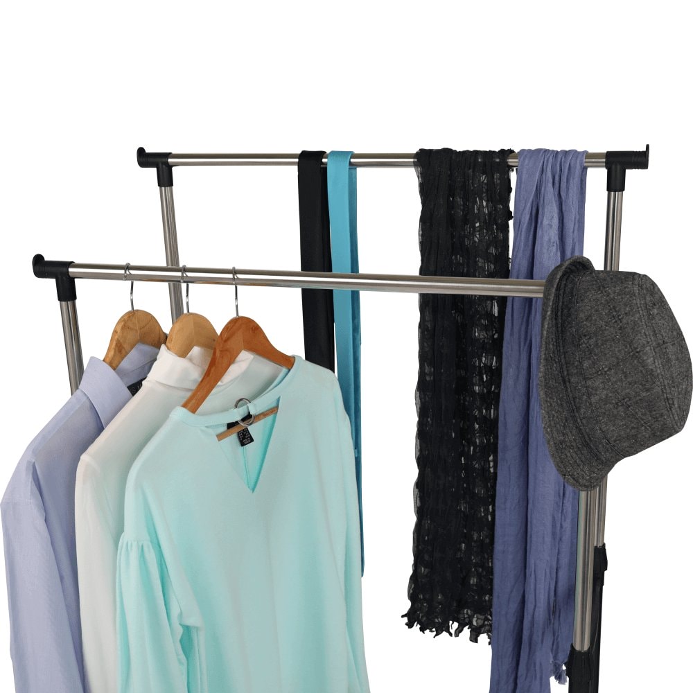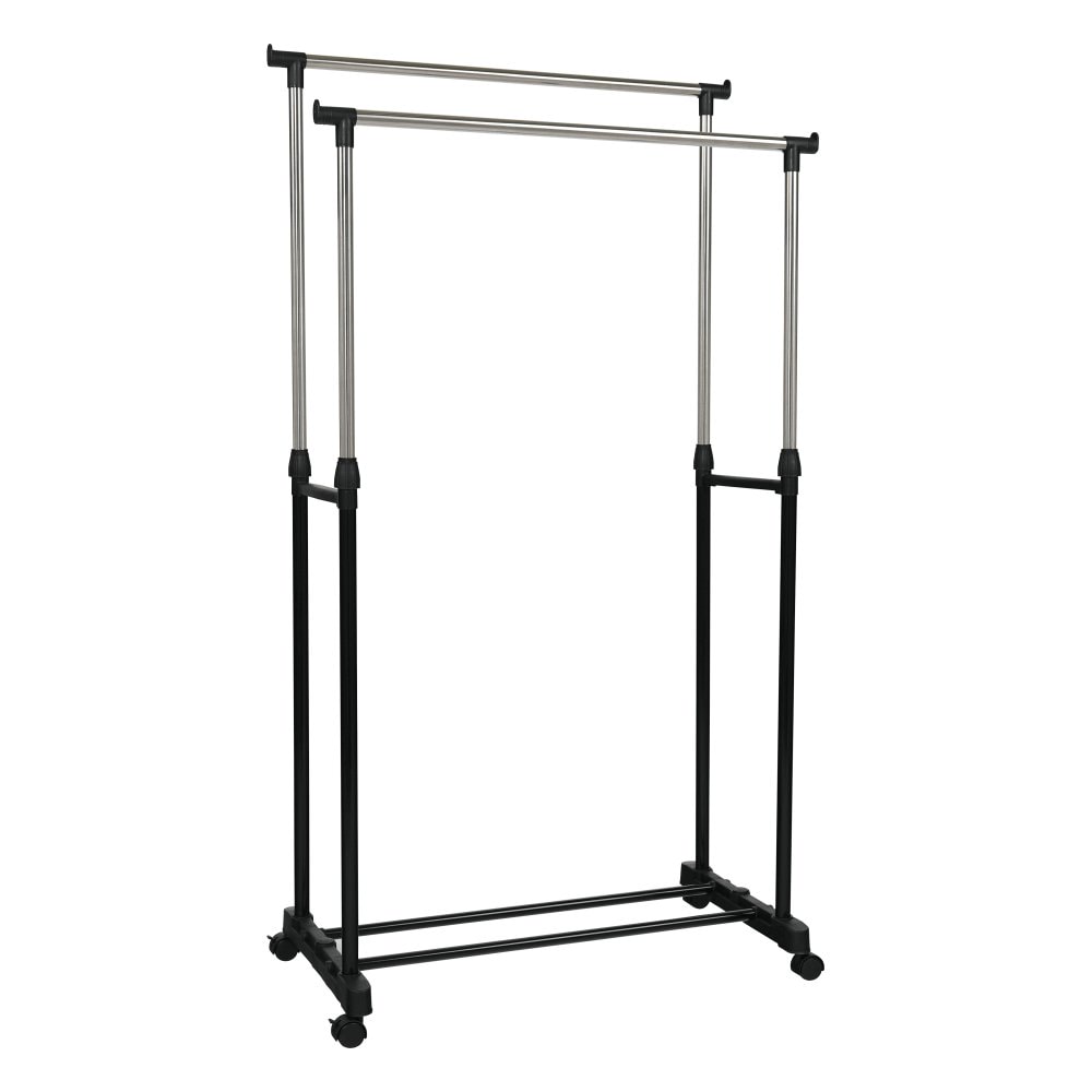 Pojízdný věšák s kolečky a dvěma závěsnými výškově nastavitelnými tyčemi v provedení nerezový kov + černý plast.