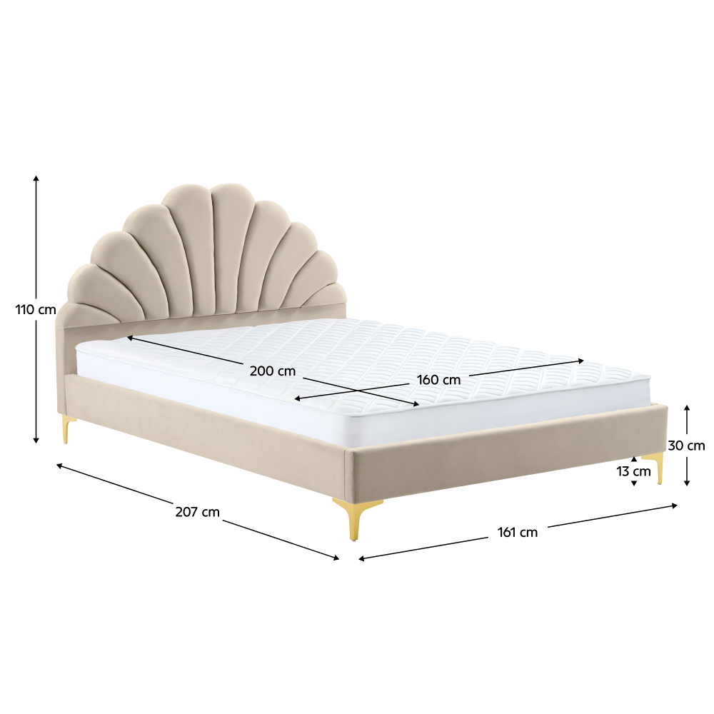 Materiál: Velvet látka/MDF/dřevotříska Oděruodolnost textilie podle testu Martindale: 25 000-30 000 oděrů Barva: béžová Rozměry (ŠxHxV): 161x207x110 cm Plocha na spaní (ŠxD): 160x200 cm Výška po rošt: 27 cm Výška bočnice: 30 cm Nosnost na osobu: 110 kg Dekorativní prošívané čelo ve tvaru mušle Na…
