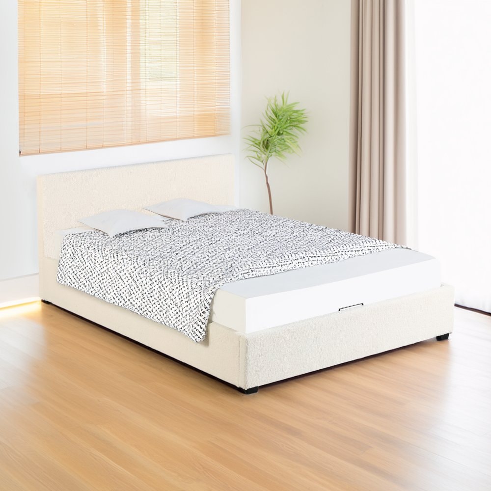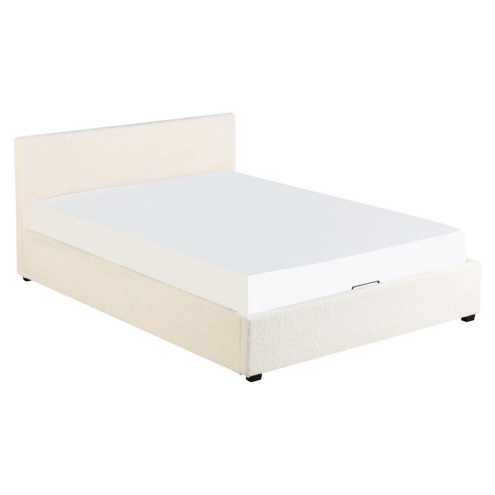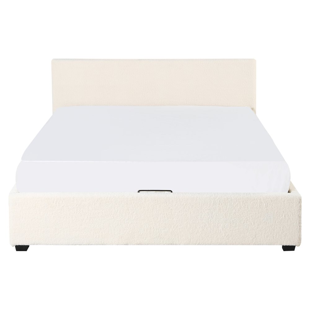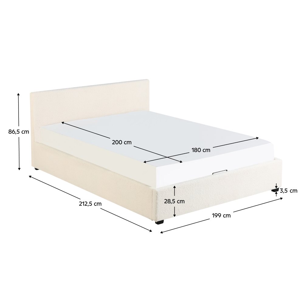 Materiál: látka Bouclé/melaminovaná MDF Oděruodolnost textilie podle testu Martindale: 70 000 - 100 000 oděrů Barva: bílá Rozměry (ŠxHxV): 199x212,5x86,5 cm Plocha na spaní (ŠxD): 180x200 cm Výška po rošt: 28 cm Nosnost na lůžko: 250 kg S vysokým čelem Výška přední čelo: 32 cm Výška zadní čelo: 86,5 cm Na nožičkách Materiál nožiček: borové dřevo Barva nožiček: černá Výška nožiček: 3,5 cm Dodávána s vyklápěcím roštem Prostor mezi lamelami: 5 cm Plynové písty Dodáváno bez matrace Možnost zakoupit matraci z naší nabídky Doporučená výška matrace: max. 20 cm Zapuštění matrace: 3,5 cm Elegantní design Dodáváno v demontu