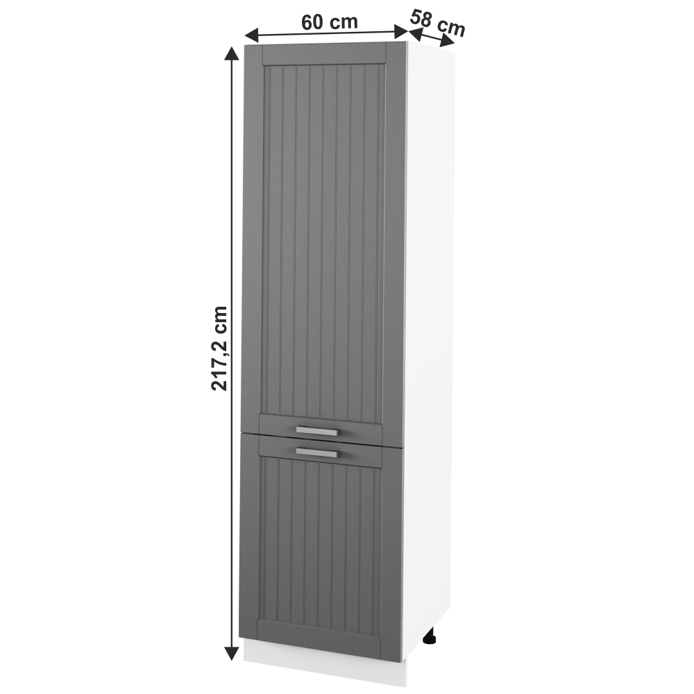 Materiál skříňka: DTD laminovaná / MDFBarva skříňka: tmavě šedá / bíláMateriál úchytka: kovBarva úchytka: matný chromRozměry (ŠxHxV): 60x58x217,2 cmTloušťka materiálu: 16 mmPolicováS úchytkamiDodáváno se soklemS úchytkamiPlastové nožičkyDodáváno v demontu