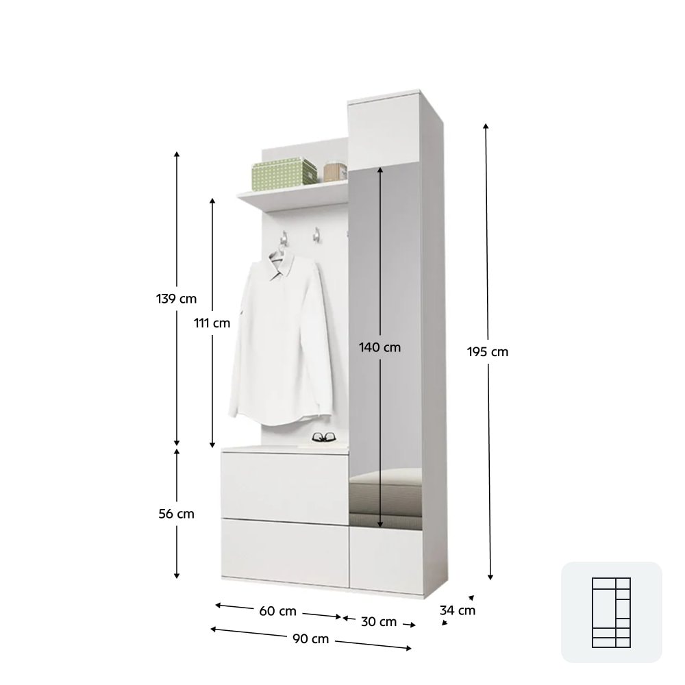Materiál: laminovaná DTD Barva: bílá Rozměry (ŠxHxV): 90x34x195 cm S výklopným botníkem se zrcadlem S policovou skříní věšákový panel Otevírání PUSH - UP ABS hrany věšáková část Dodávané v demontu