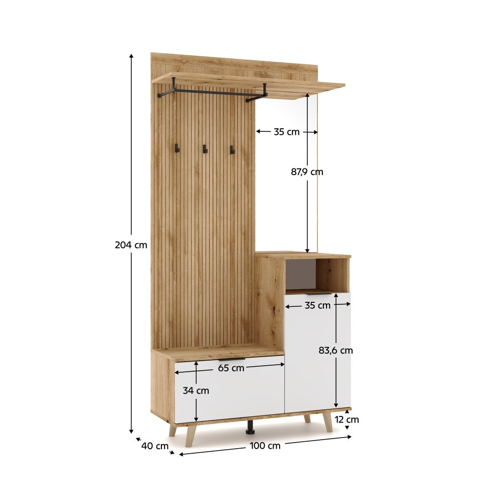 Materiál: DTD/ABS hrany Barva: dub evoke/bílá Rozměry (ŠxHxV): 100x40x204 cm Tloušťka materiálu: 1,6 cm Otevřený úložný prostor Skříňka s policemi Nosnost police: 5 kg Výklopný botník Nosnost vrchní desky botníku: 10 kg Věšáková část Nosnost věšákové tyče: 1 kg 3 háčky Nosnost háčku: 1 kg Se…