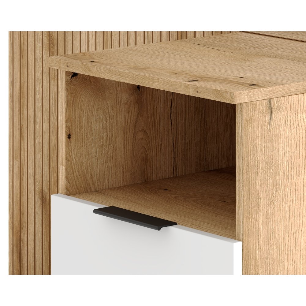 Sestava se skládá z policové skříňky, výklopného botníku, zrcadla, věšákového panelu a otevřeného úložného prostoru. Vyrobena je z kvalitní DTD doplněné o ABS hrany. Dokonalá barevná kombinace dub evoke / bílá je moderní stálicí. Chloubou jsou lamely, které zdůrazňují charakter a působí nadčasově. Předsíň nabízí úložný prostor v podobě polic, háčků a věšákové tyče. O stabilitu se postarají dřevěné nožičky a jedna plastová středová nožička. Pro jednodušší manipulaci s nábytkem je předsíňová sestava NODRI obohacena o plastové úchytky.